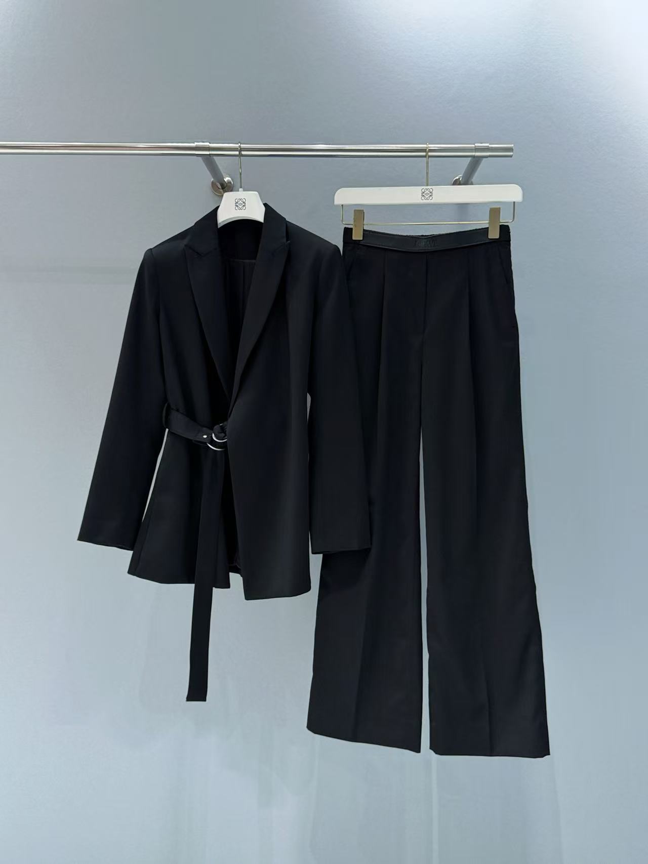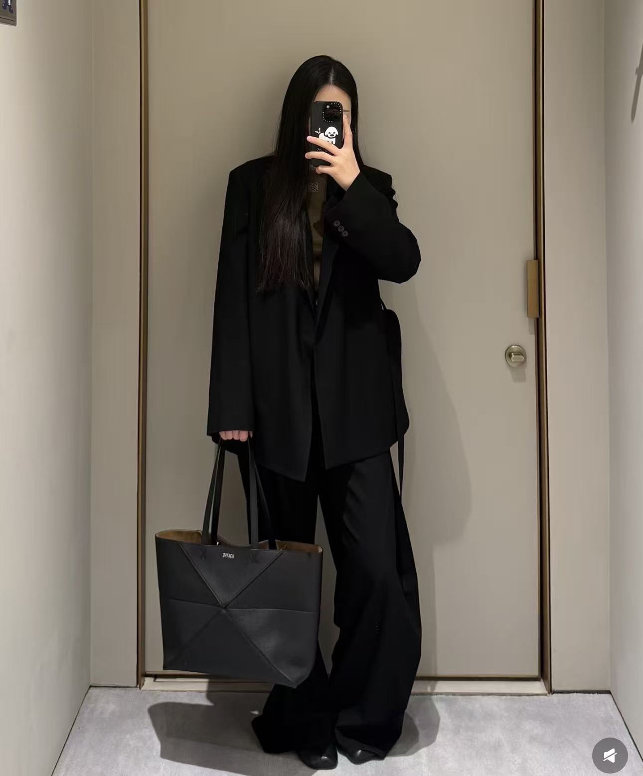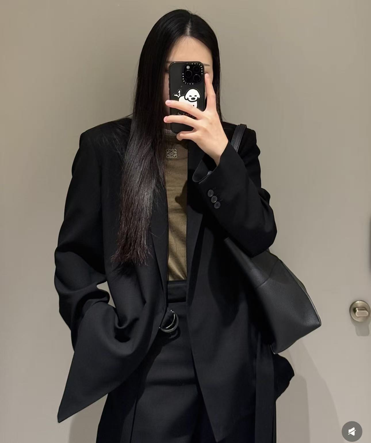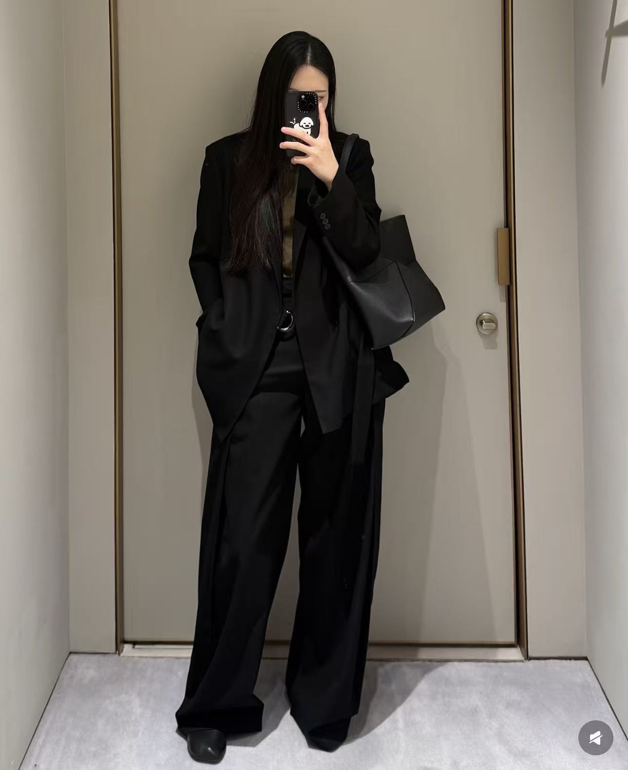 經典黑色套裝最怕沉悶,但這件在腰側加入了獨特的設計細節,瞬間打破傳統西裝的呆板,讓俐落的剪裁中多了一份隨性的鬆弛感。搭配同色系的落地闊腿褲,視覺比例直接拉長,顯瘦效果無敵。