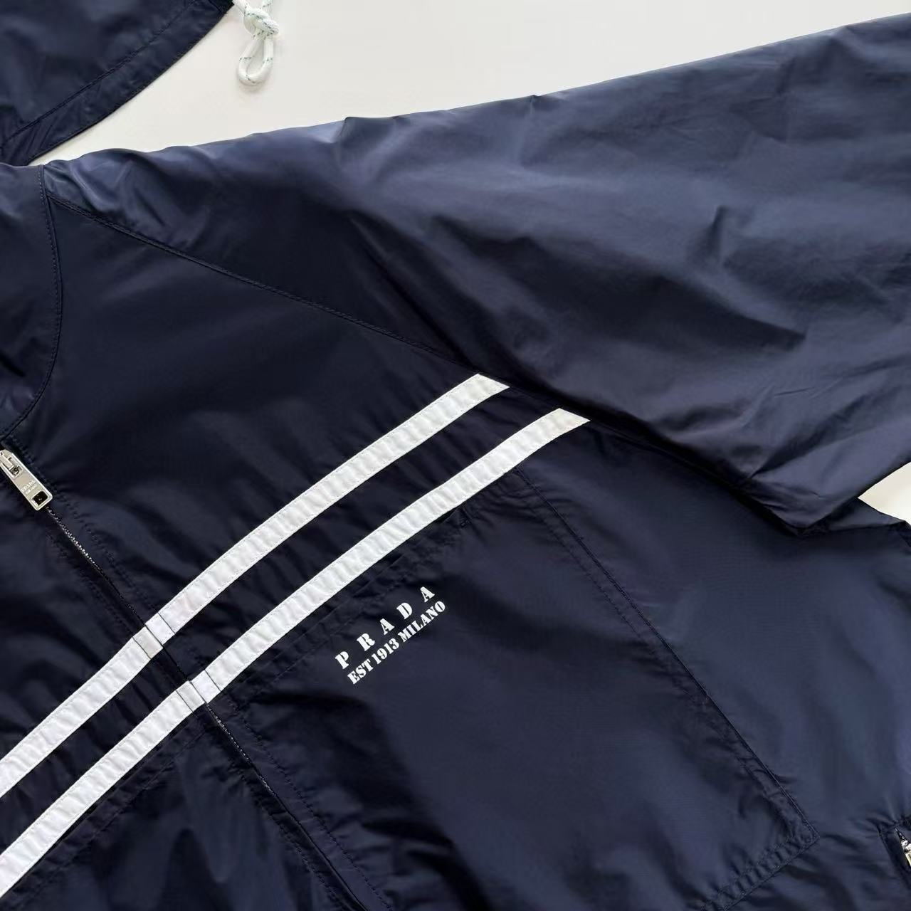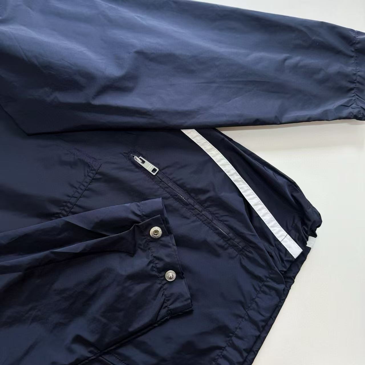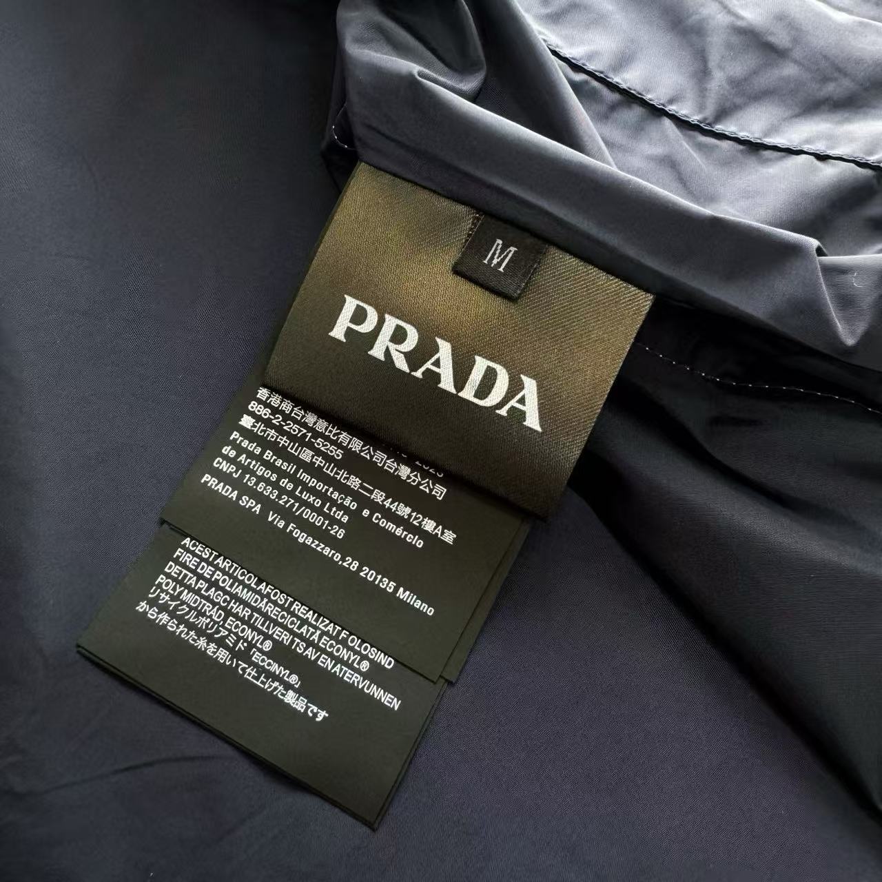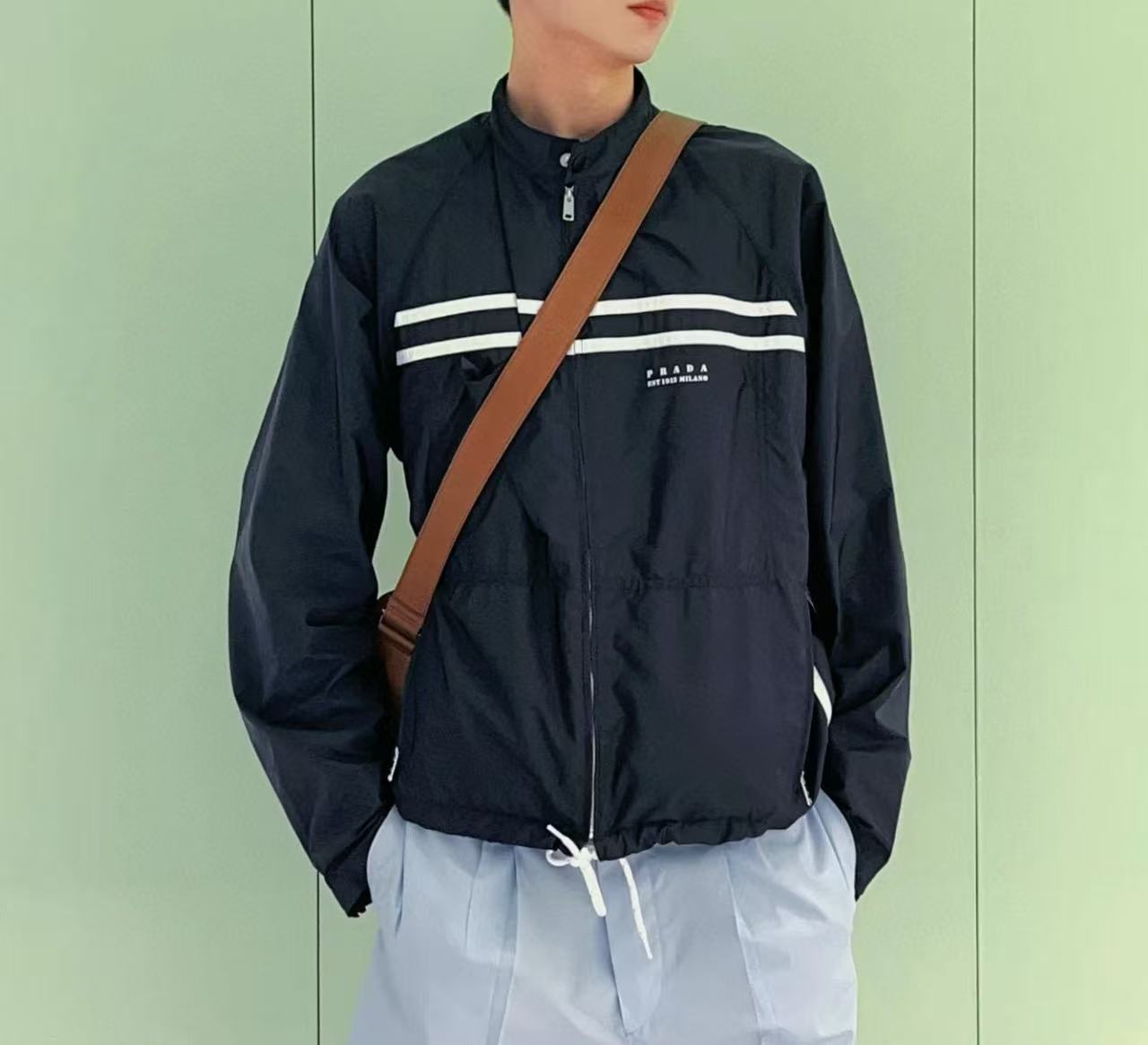整件夾克採用自家開發的 Re-Nylon 再生尼龍面料製作——這種創新面料是透過回收海洋中的塑膠廢棄物,經由精密工藝重新轉化而成,不僅擁有高機能性與防潑水特性,更象徵時尚與環保並進的核心精神。