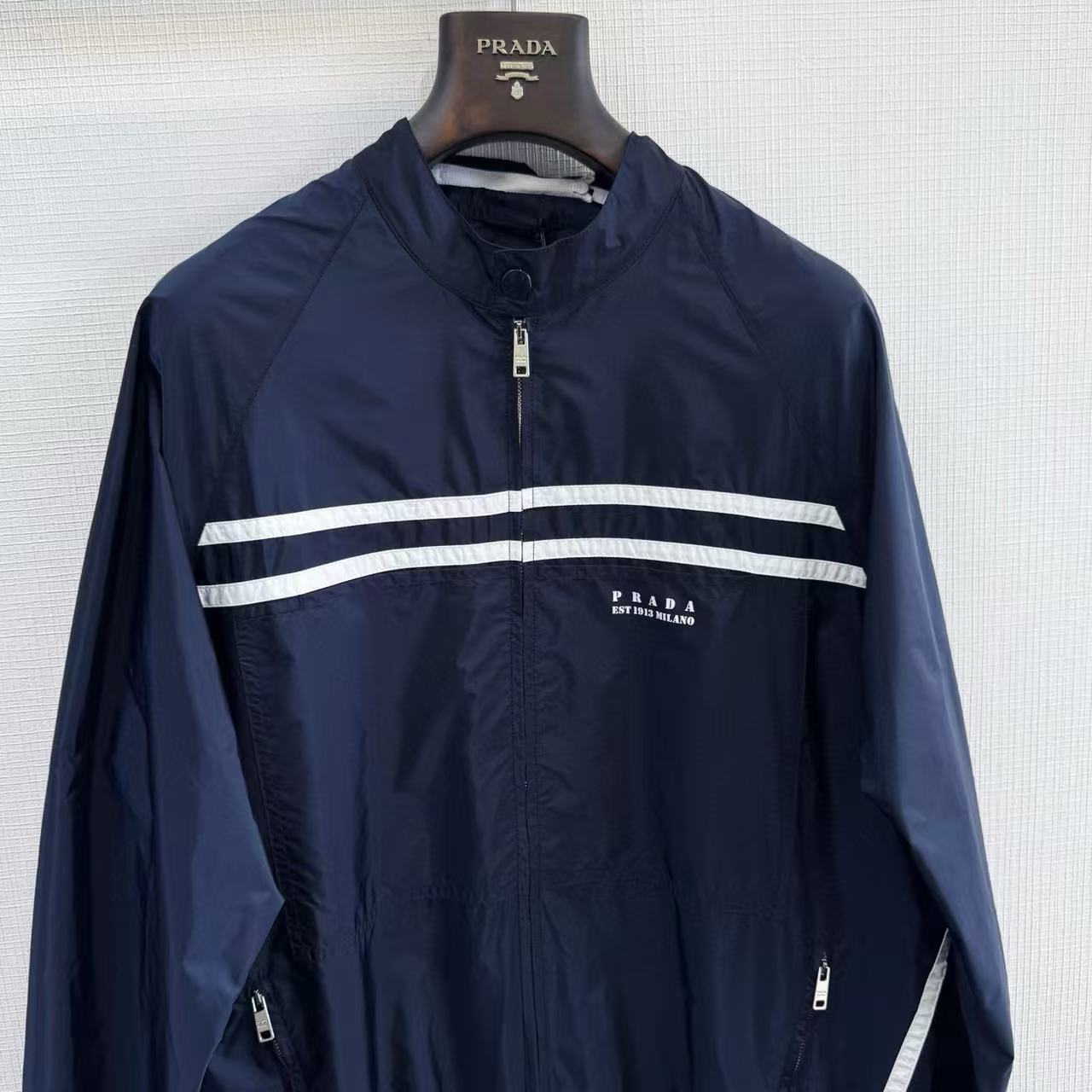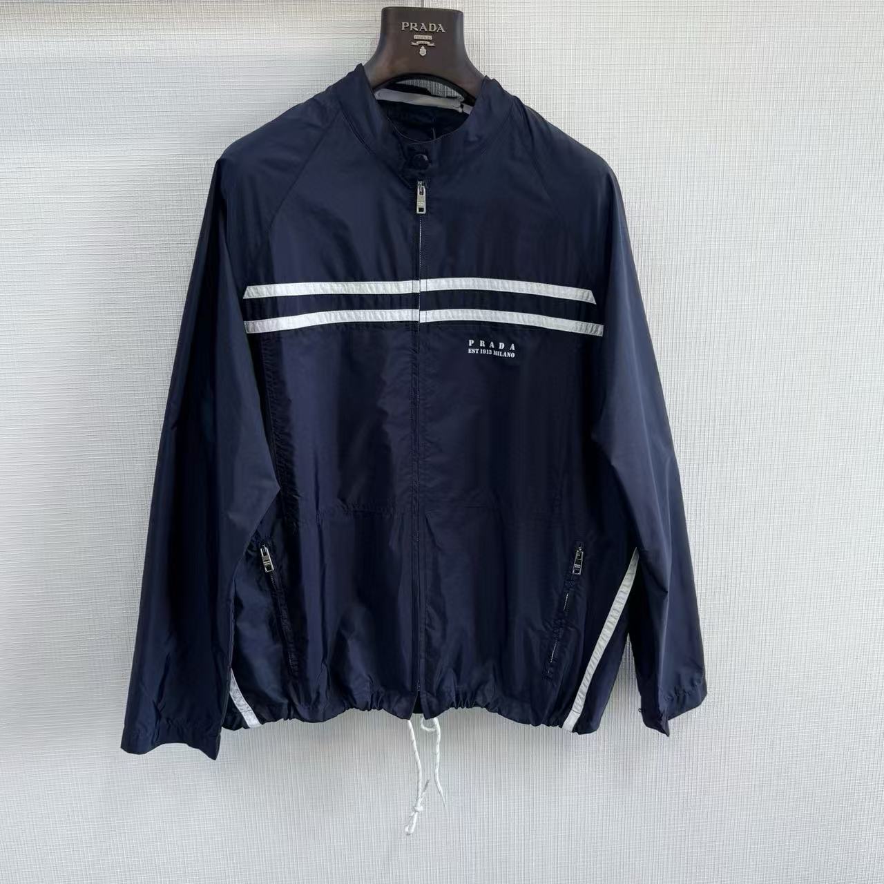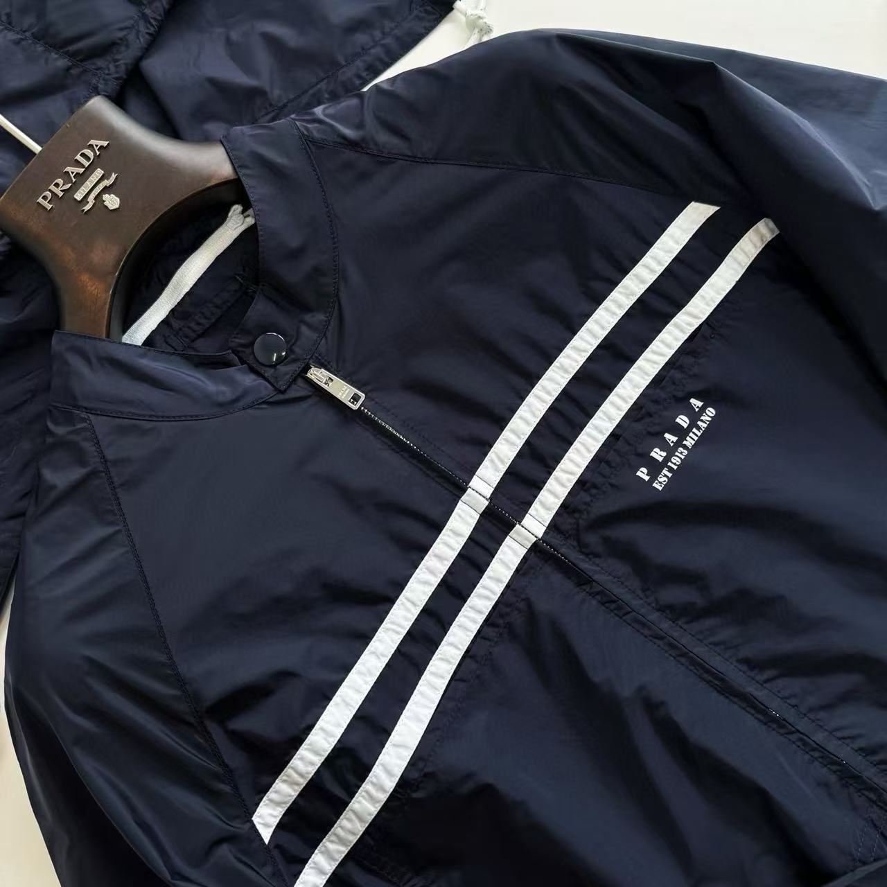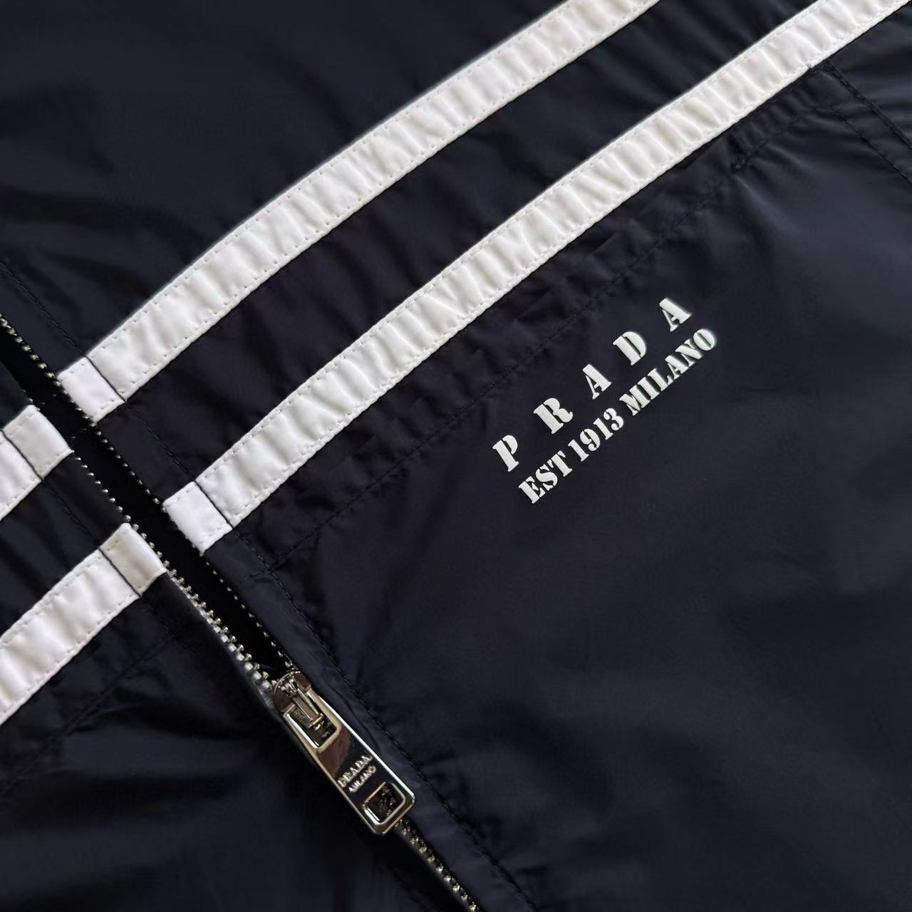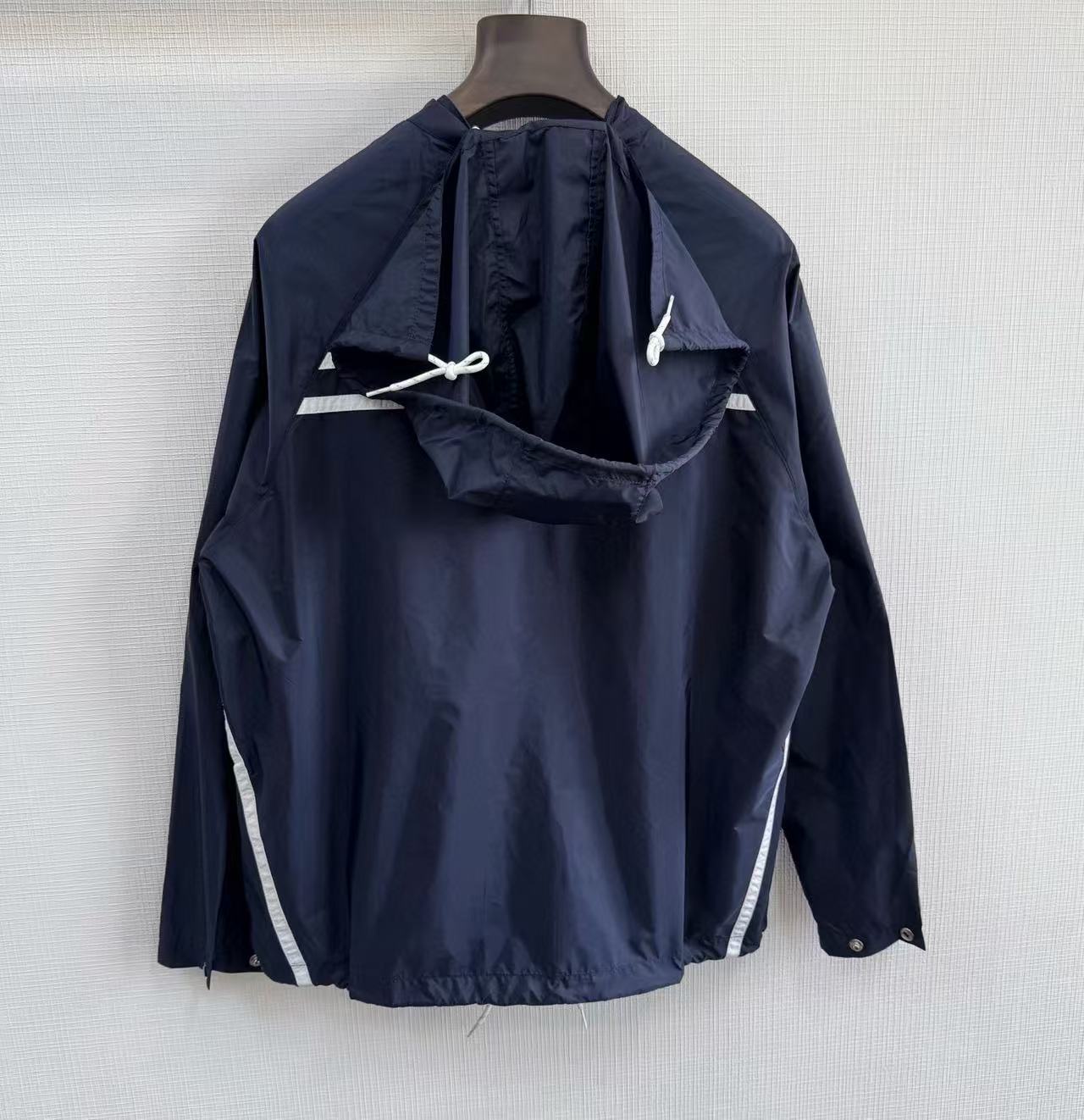 整件夾克採用自家開發的 Re-Nylon 再生尼龍面料製作——這種創新面料是透過回收海洋中的塑膠廢棄物,經由精密工藝重新轉化而成,不僅擁有高機能性與防潑水特性,更象徵時尚與環保並進的核心精神。