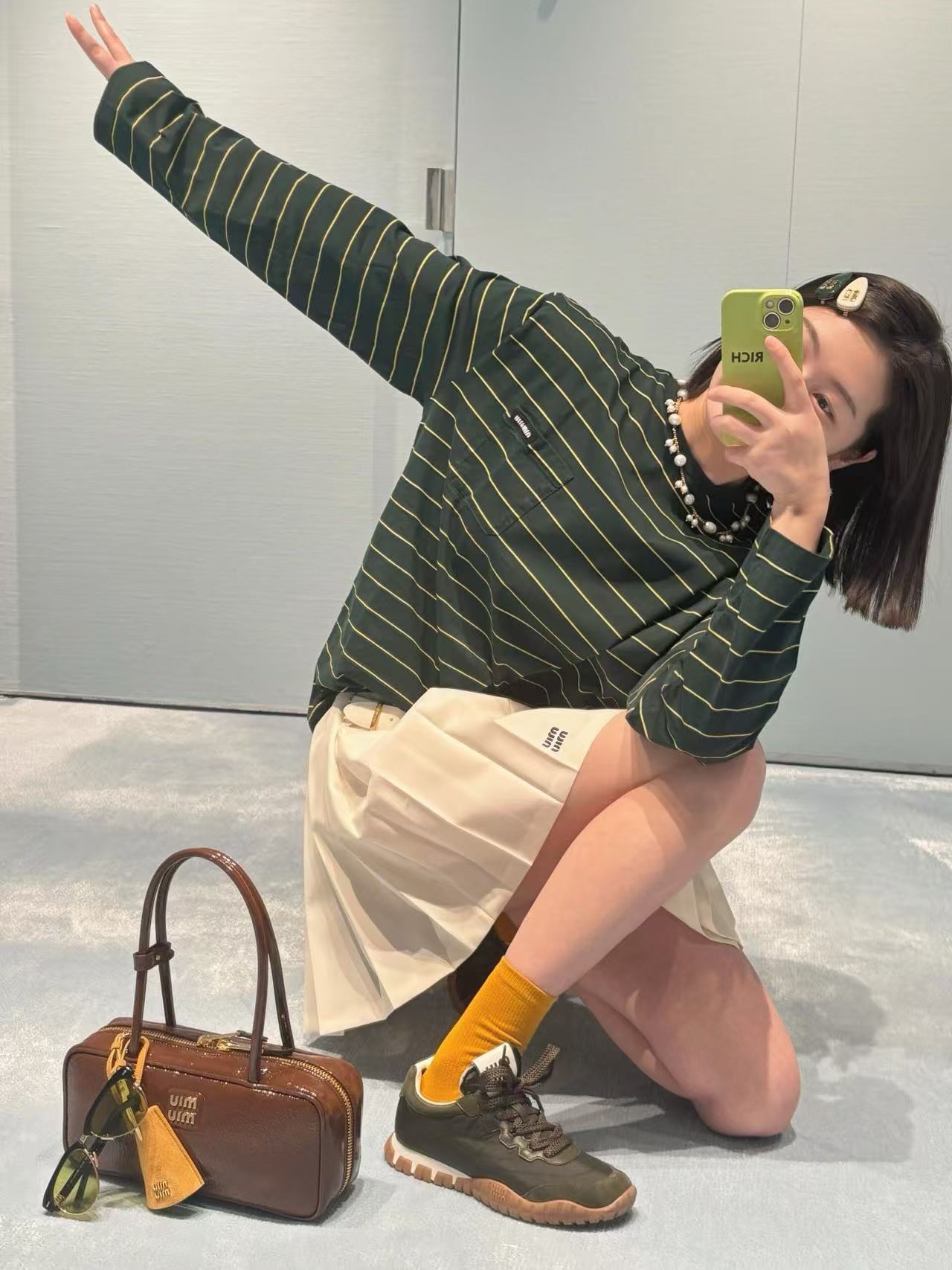 這件真的太火了!新色綠條紋一上身,顯白效果超驚豔,還帶點復古氣息。大廓形版型不挑身材,寬鬆慵懶的輪廓穿起來就是很有氛圍感。