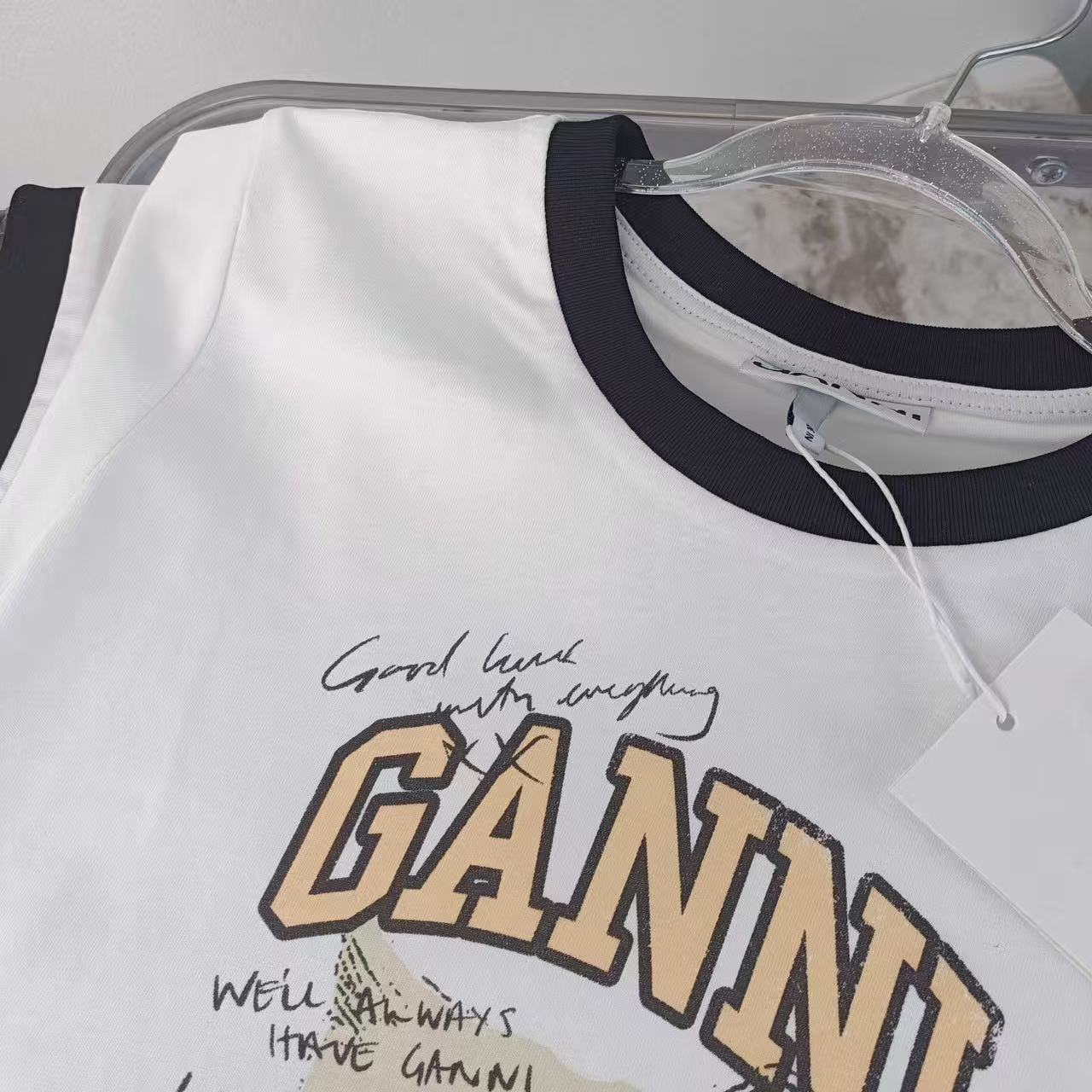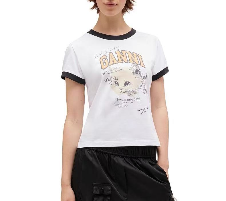 2025早秋新品 Ganni家 貓咪圖案撞色修身短袖