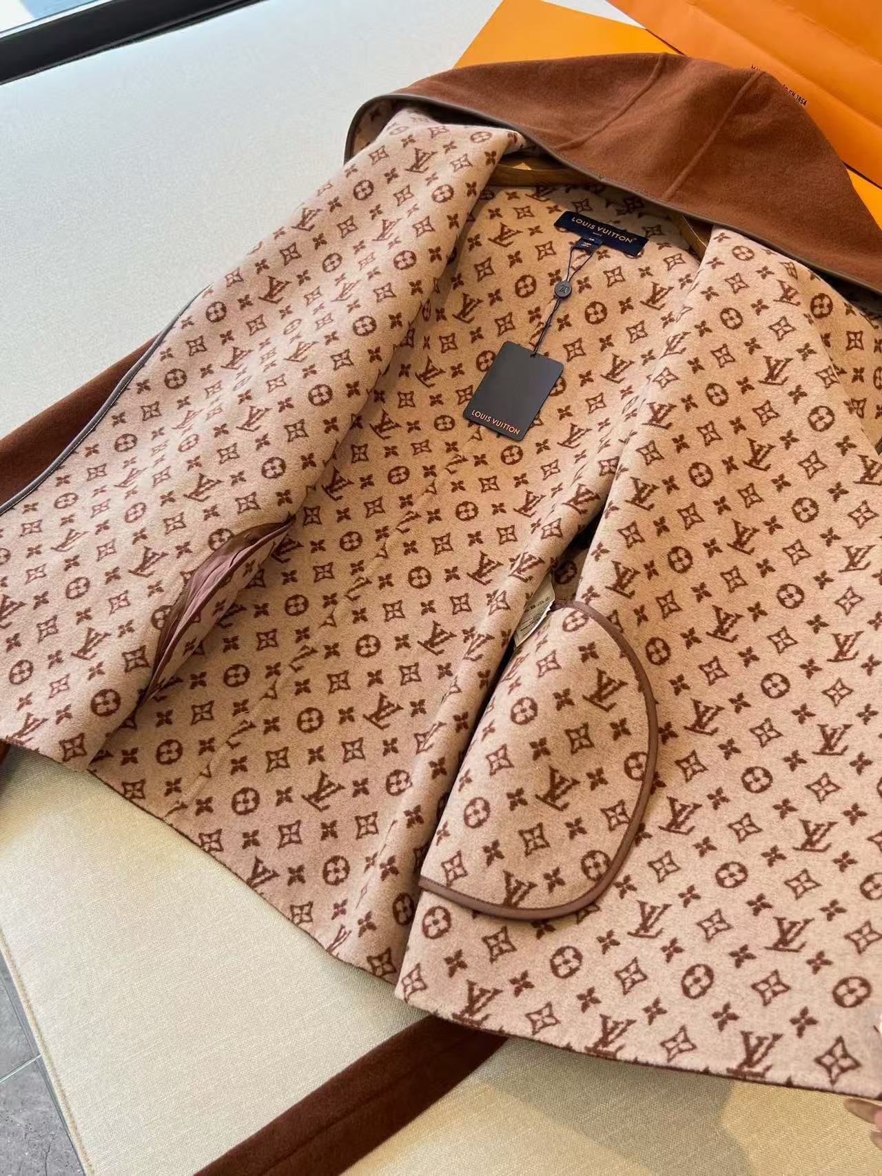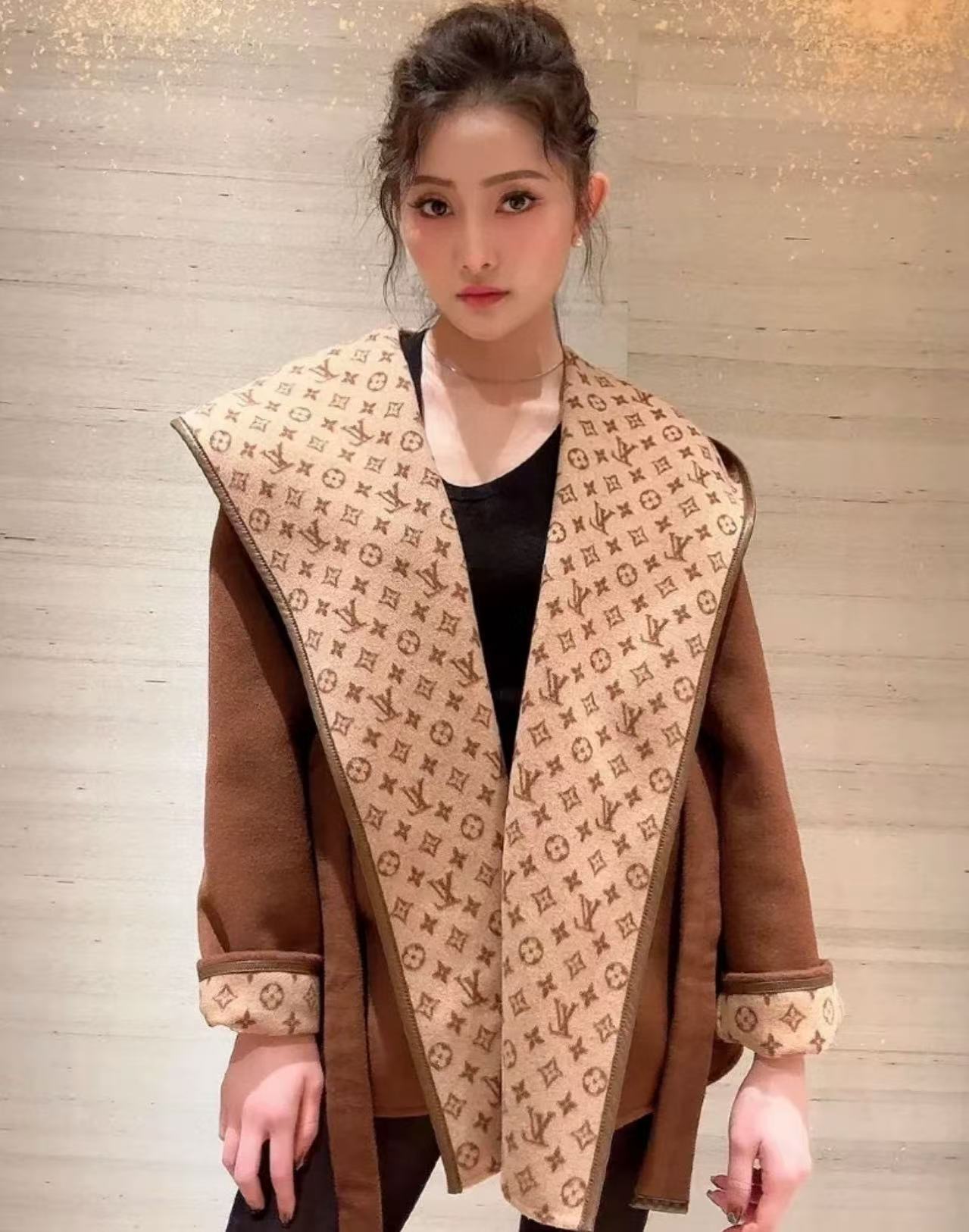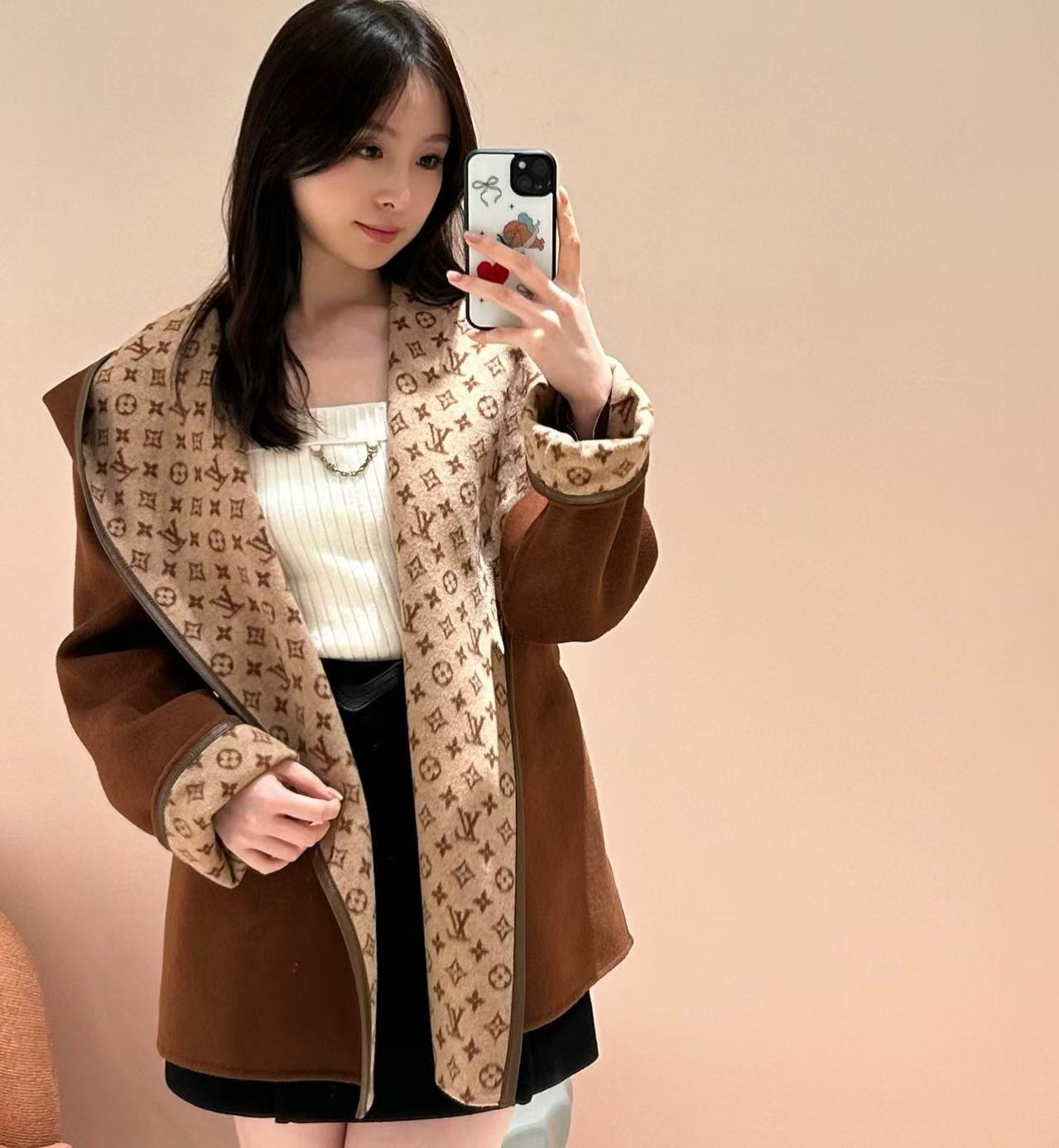 這款大衣的材質真的非常講究,使用了雙面羊毛,主面料是 99%的綿羊毛和1%的桑蠶絲。摸起來溫潤、滑順又保暖,完全是那種頂級精品的奢華觸感。一面是經典的 Monogram 圖案,另一面則是簡約的素面,讓你隨心所欲地搭配不同風格,真的是太划算了!