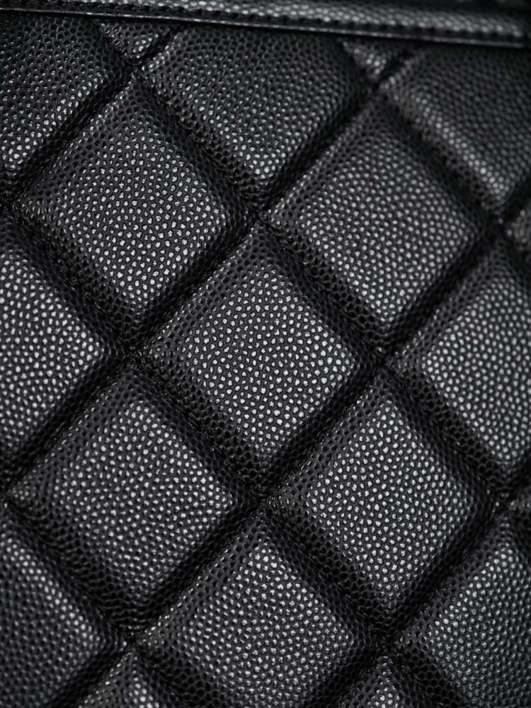 嚴選獨家原廠 HAAS 魚子醬荔枝牛皮,硬挺度高、紋理細緻,讓包型更加立體俐落,完全不同於一般休閒款的鬆軟感。包邊圓潤流暢,每一個菱格弧度均勻一致,細節精緻到位。