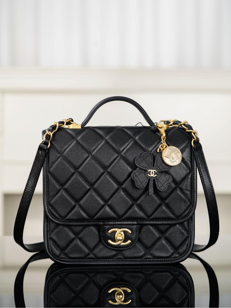 四葉草勳章吊墜是靈魂亮點,將菱格包、No.5 香水符號、雙C經典元素結合在一起,透過做舊處理和砂金質感,散發濃厚的復古氛圍。五金選用純銅砂金工藝,份量與細節都帶出高奢感。