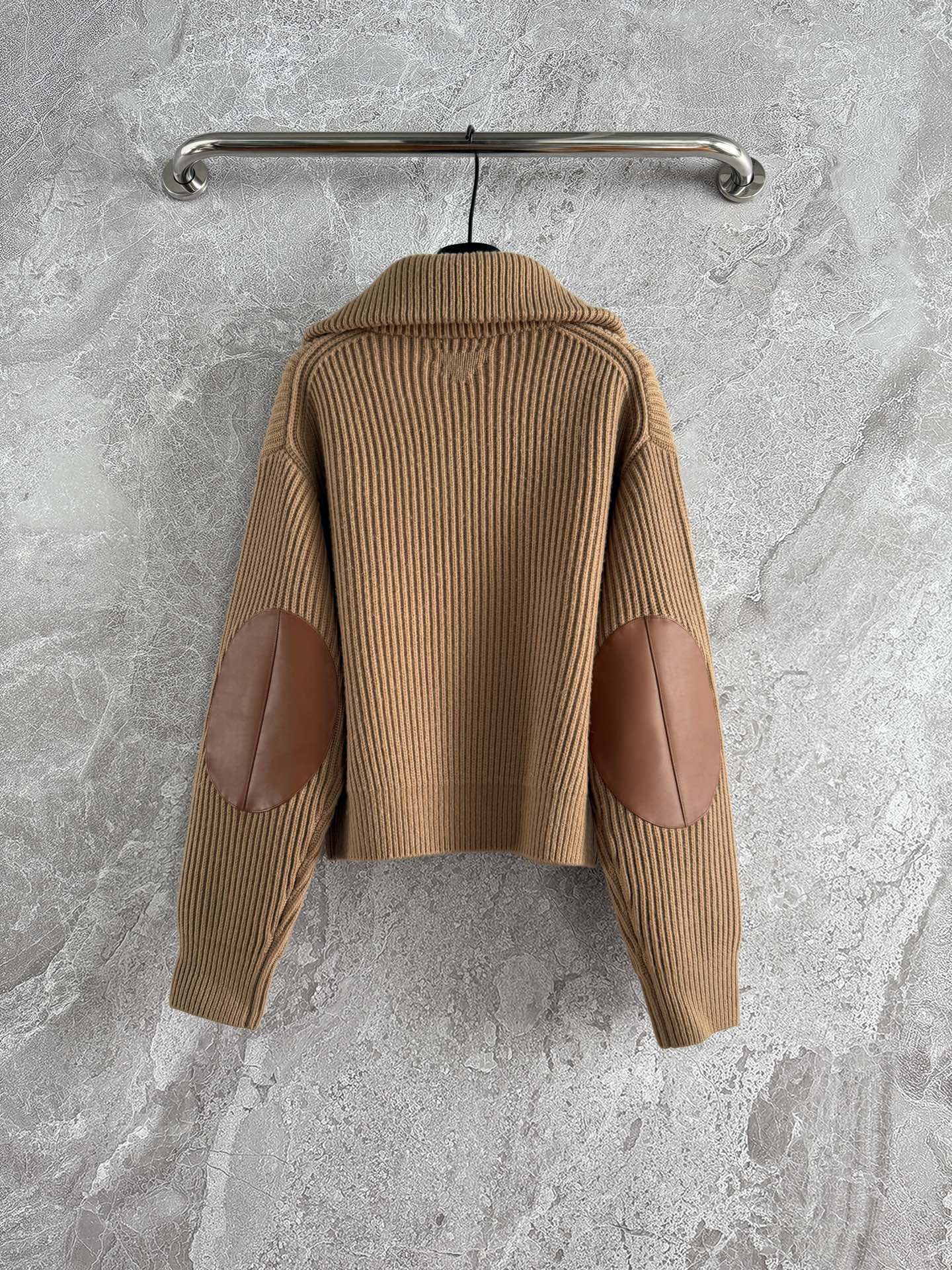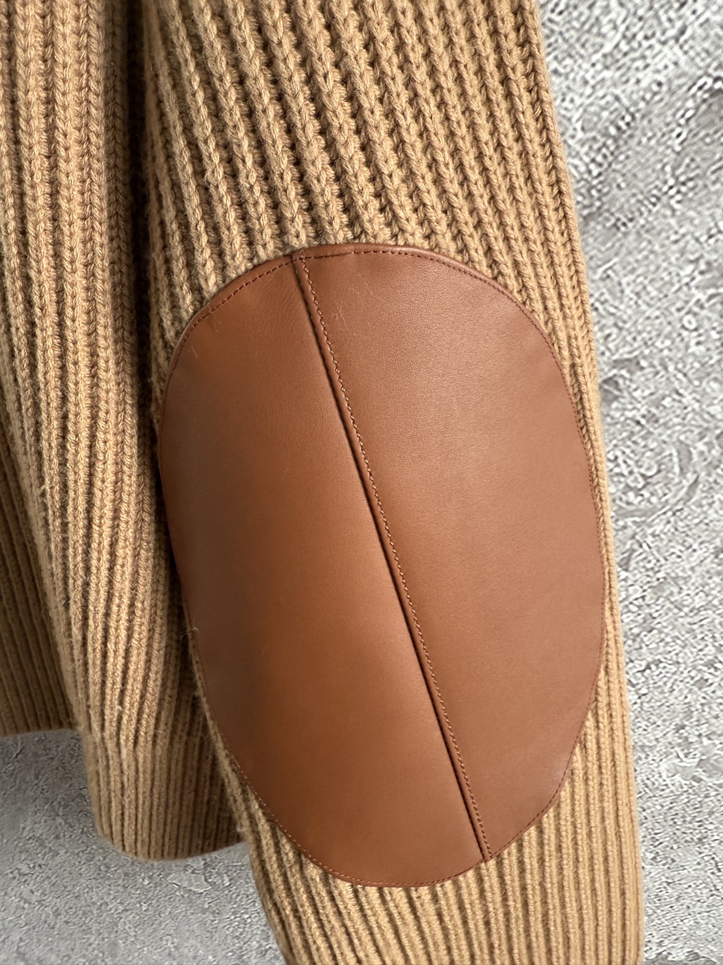 這個細節不只是一個造型亮點,也為柔軟的針織加入一點俐落與硬挺感,同時提升袖肘的耐磨度,實用又有格調,是那種越看越耐看的細節。
