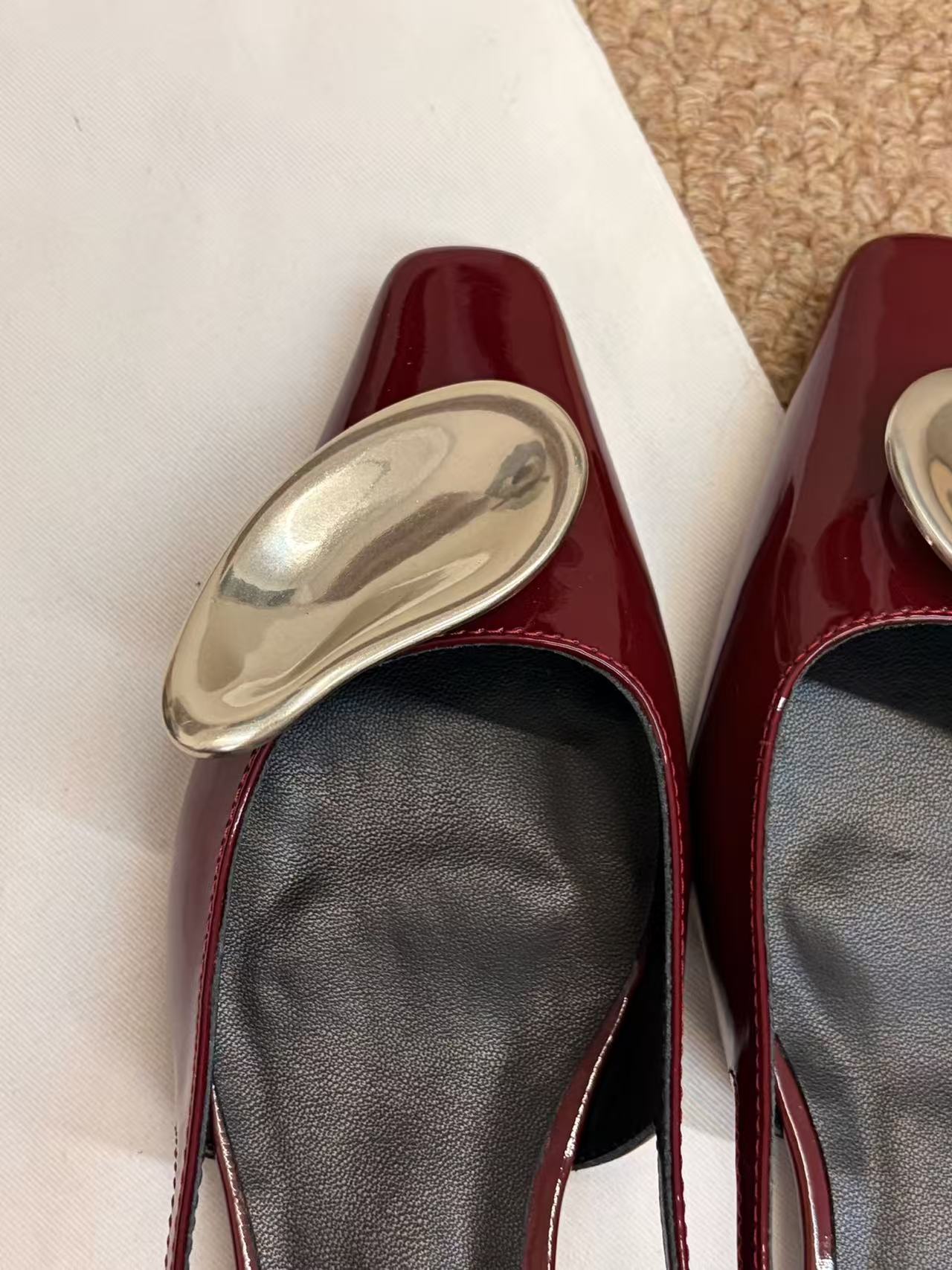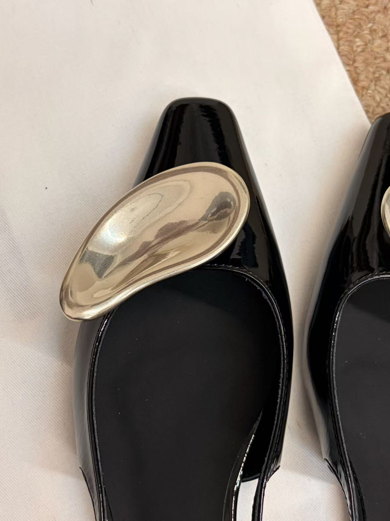 最迷人的設計在於鞋面上的銀色裝飾,它不是普通的點綴,而是帶有幾何切割感的立體浮雕,金屬做舊的質感與漆皮的高光澤互相輝映,充滿了未來主義的時髦感。