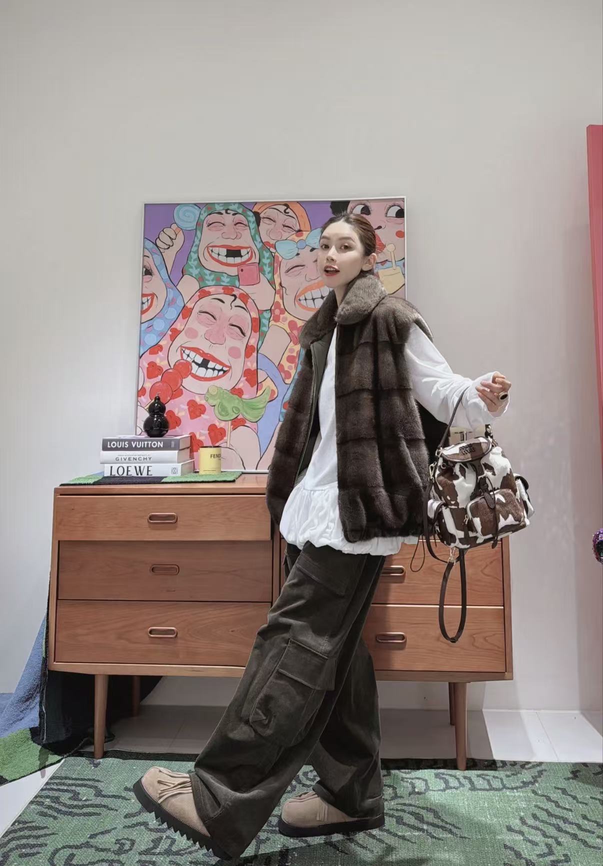 頂級材質: 嚴選優質奶牛紋皮毛拼接(質感手感俱佳),棕白撞色均勻且自然,觸感紮實,耐用度極高。