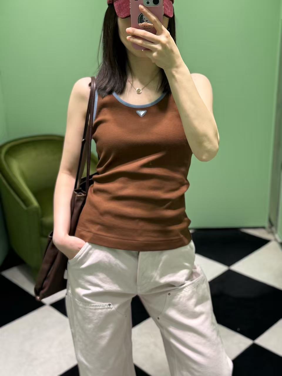 標誌性倒三角徽標點綴: 胸前的三角標採用了特供高品質五金,色澤瑩潤且鑲嵌精密。