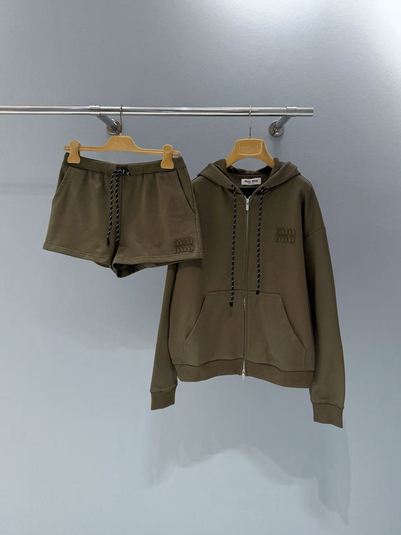 寬鬆的連帽版型搭配抽繩短褲,完美詮釋了 Miu 系最擅長的甜酷與鬆弛感,是早春穿搭裡一鍵出門、不用思考就能穿出時髦範的必備組合。