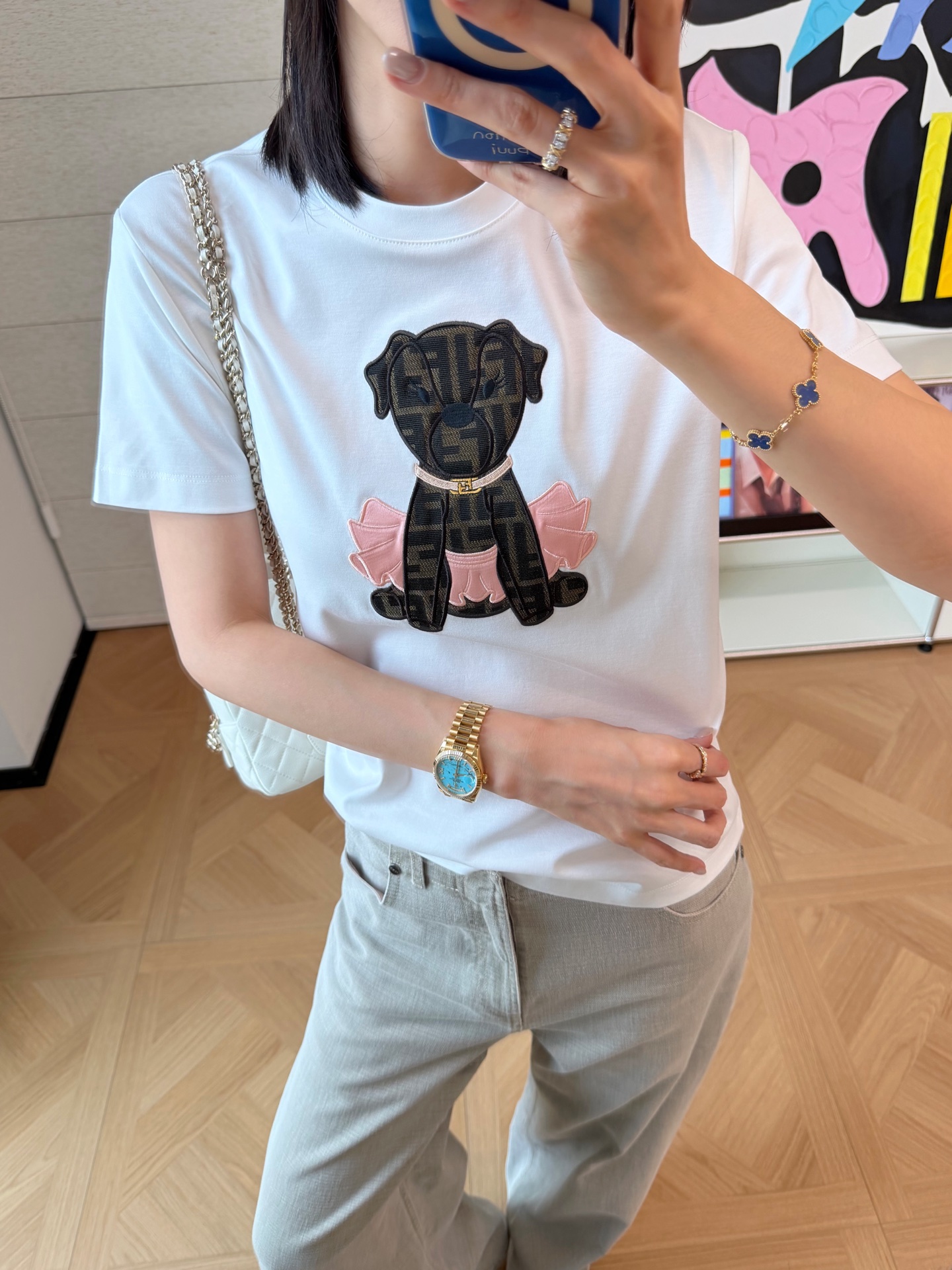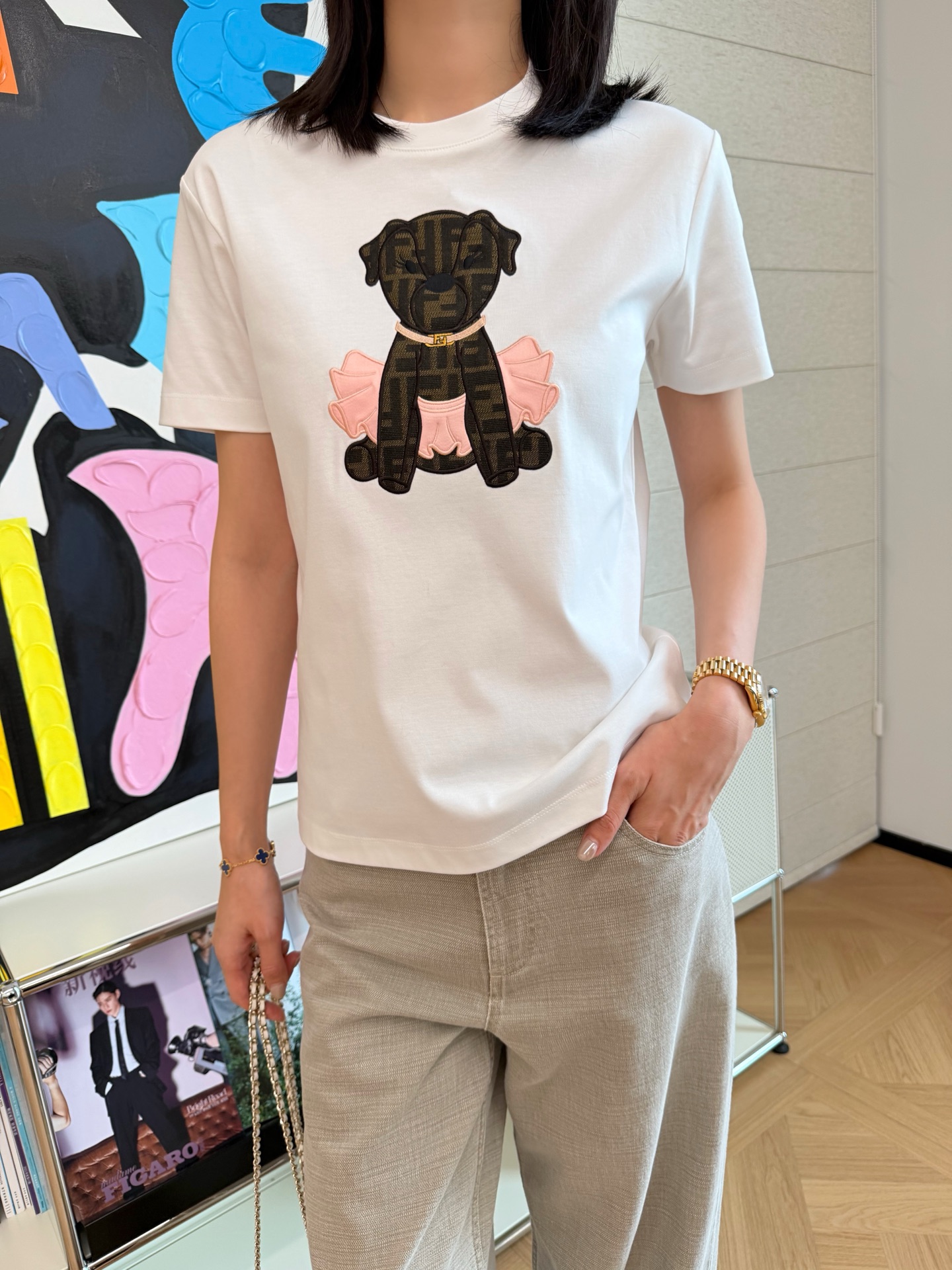 比起滿版 Logo 的高調路線,這件多了點可愛感與日常感,剛剛好地展現出氣質,也更適合日常穿搭。