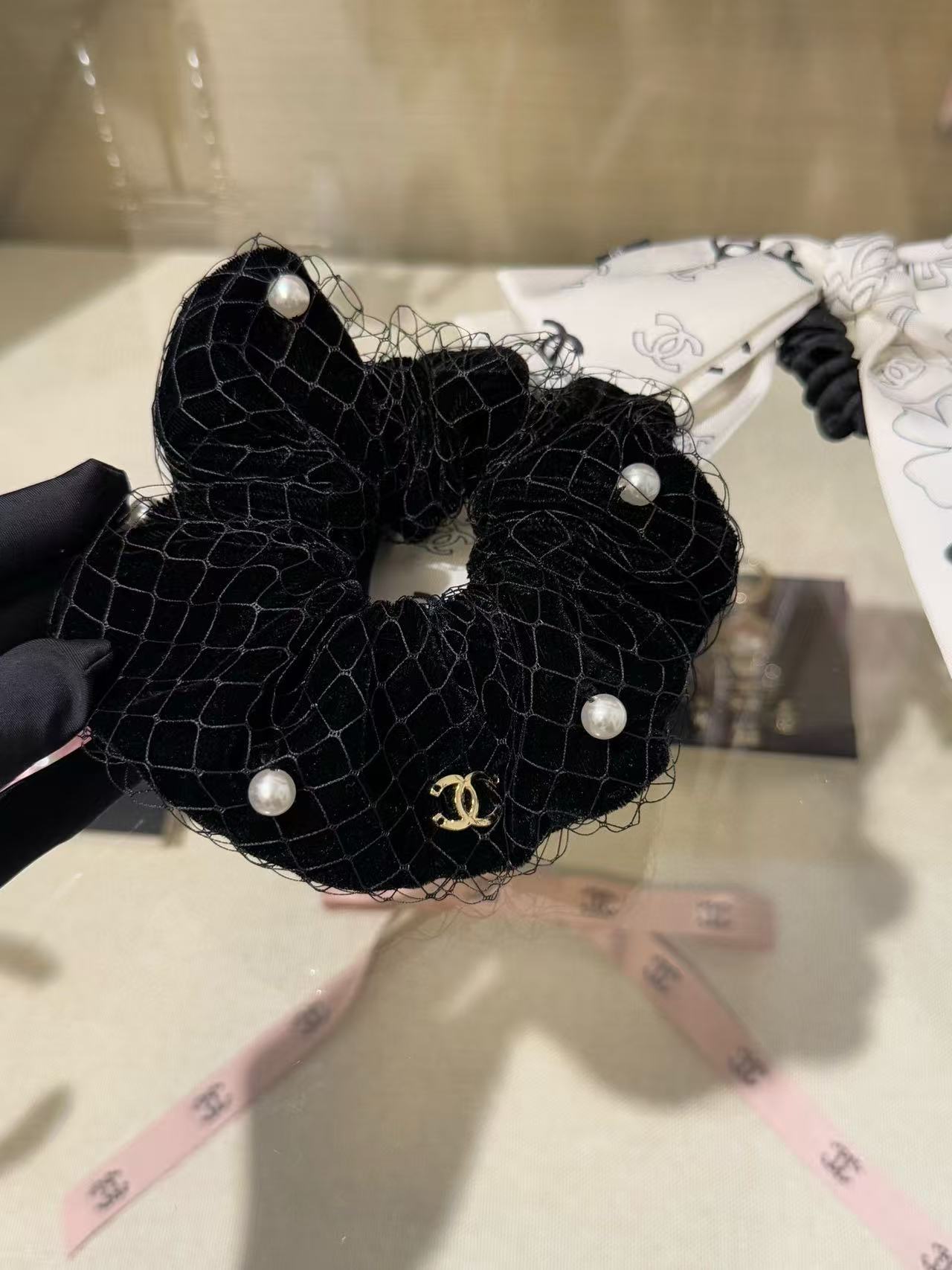 這款大髮圈以經典雙C徽標為核心,淺金色調低調奢華,黑絲絨與網紗包裹增添復古層次,小珍珠點綴則注入甜美女人味。