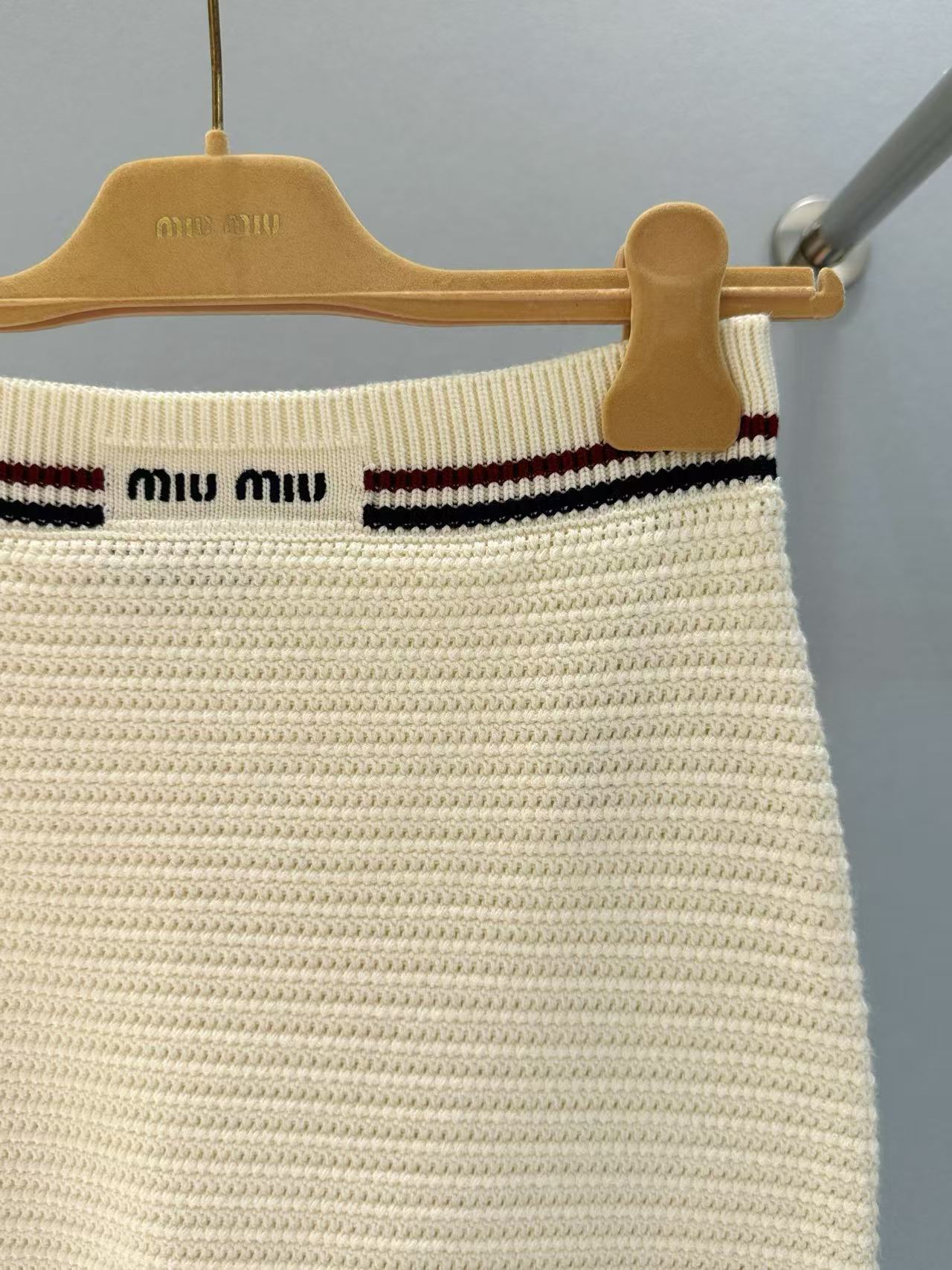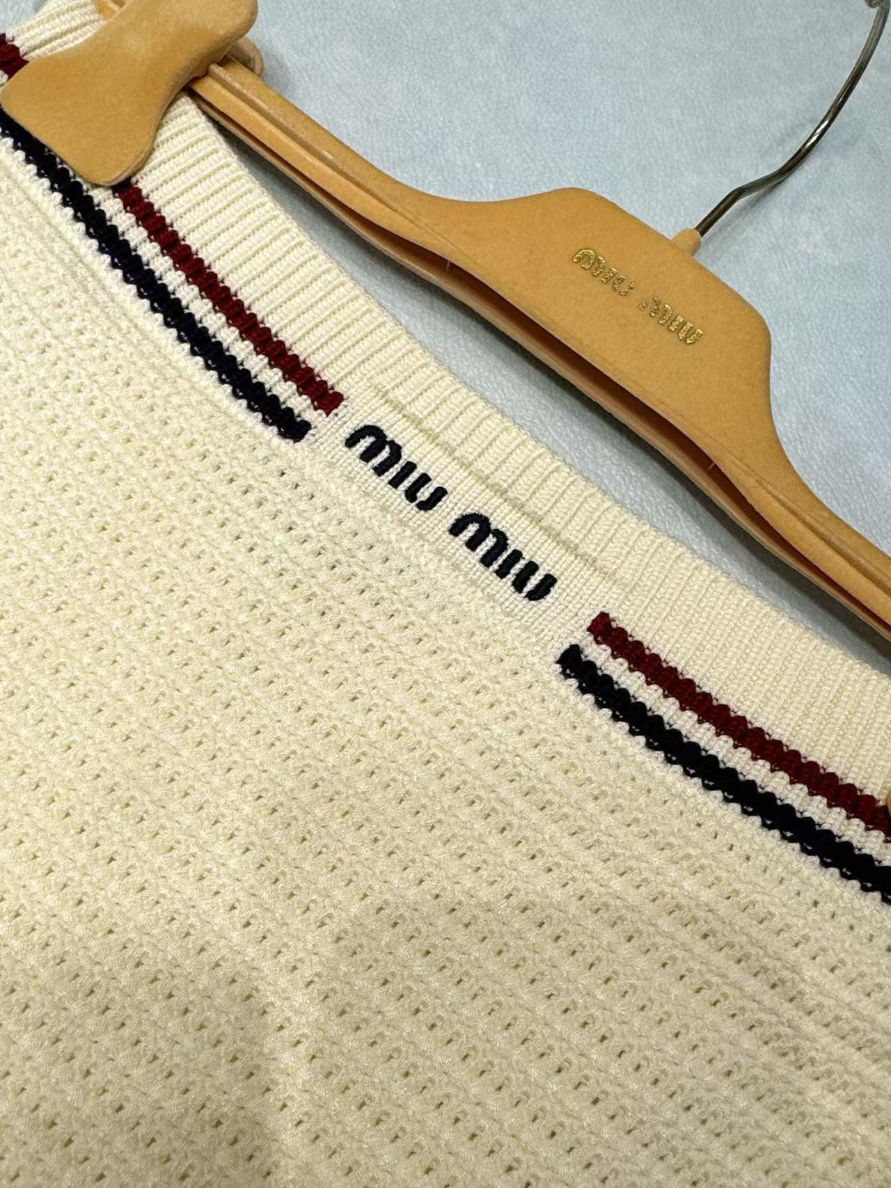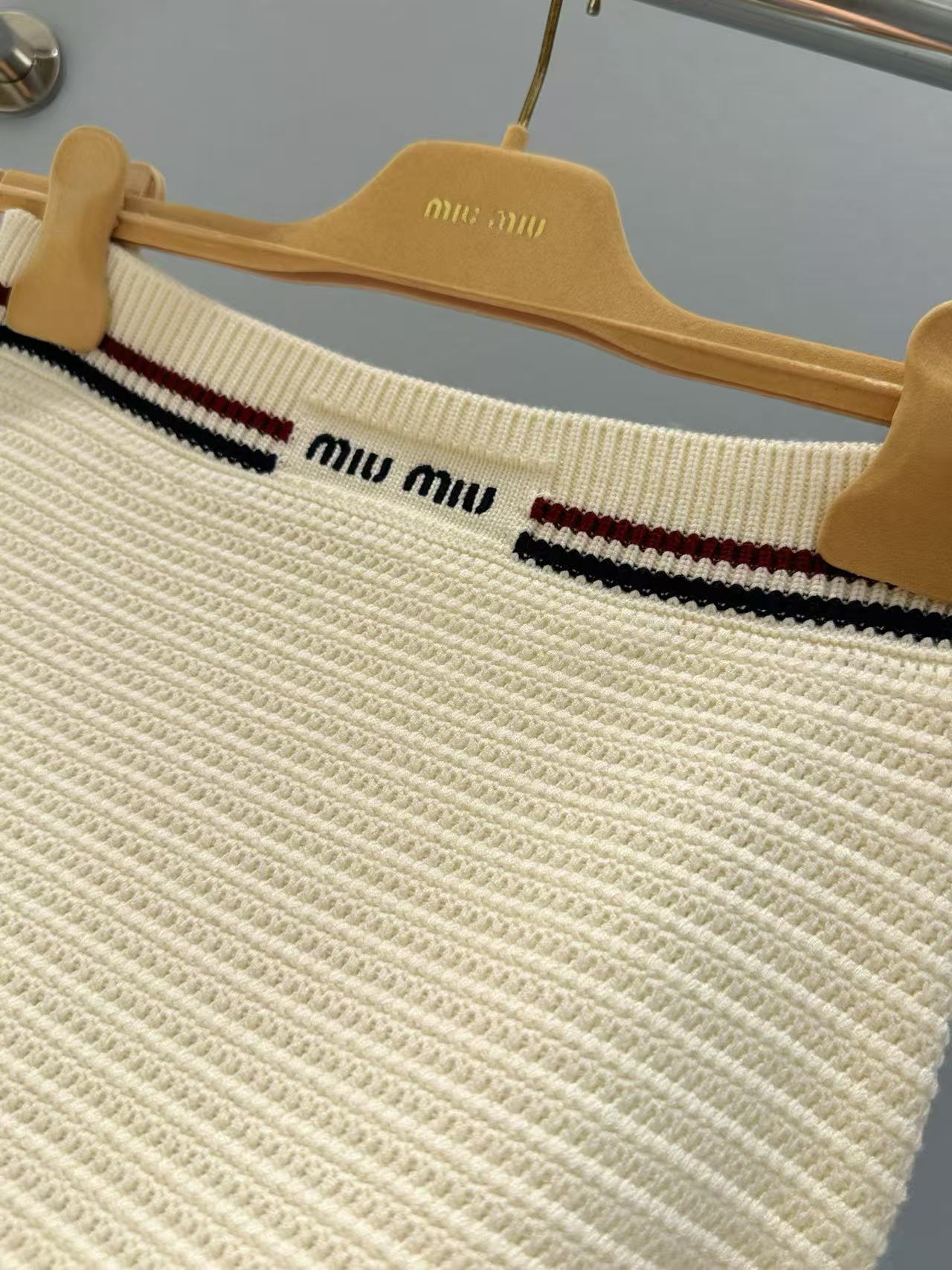 以撞色條紋與品牌刺繡徽標作為視覺亮點,清新又有辨識度,完美體現 Miu 系女孩的甜美調性。