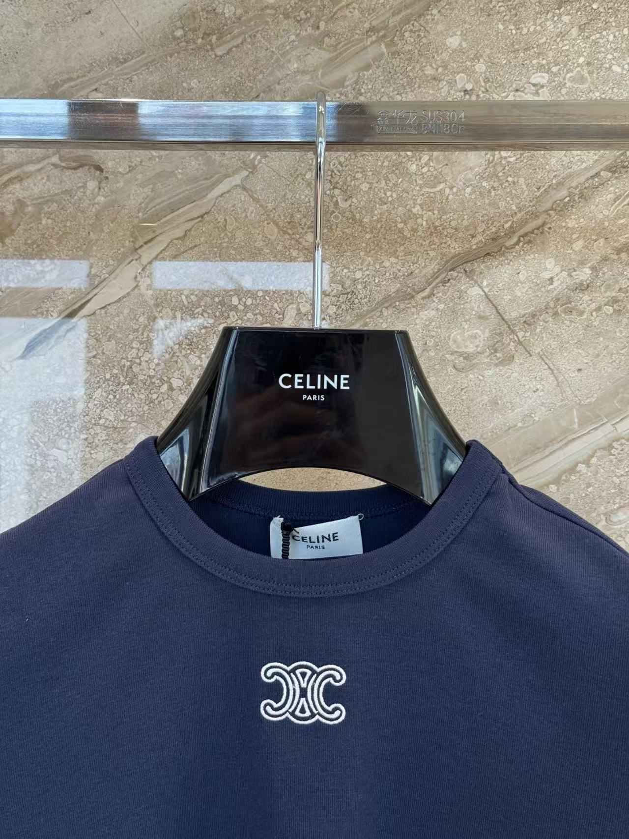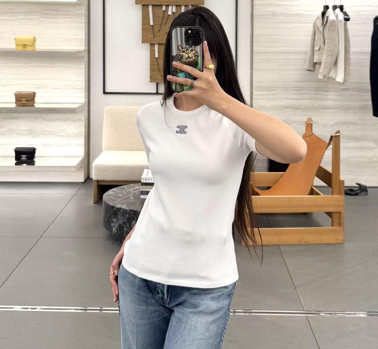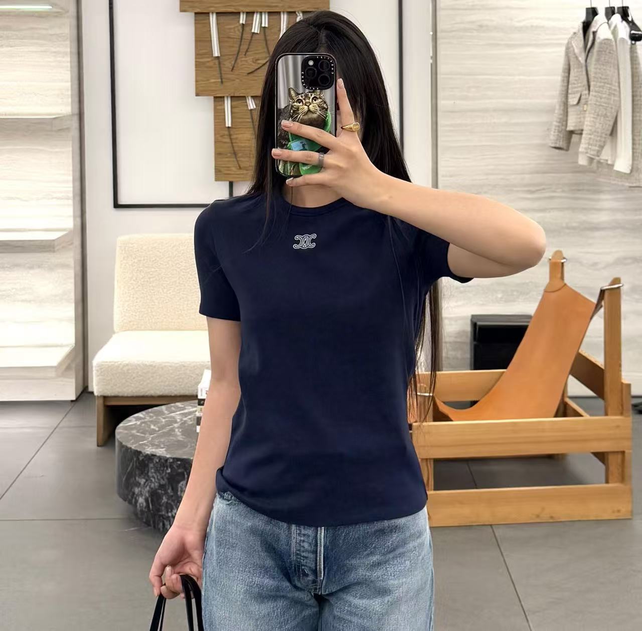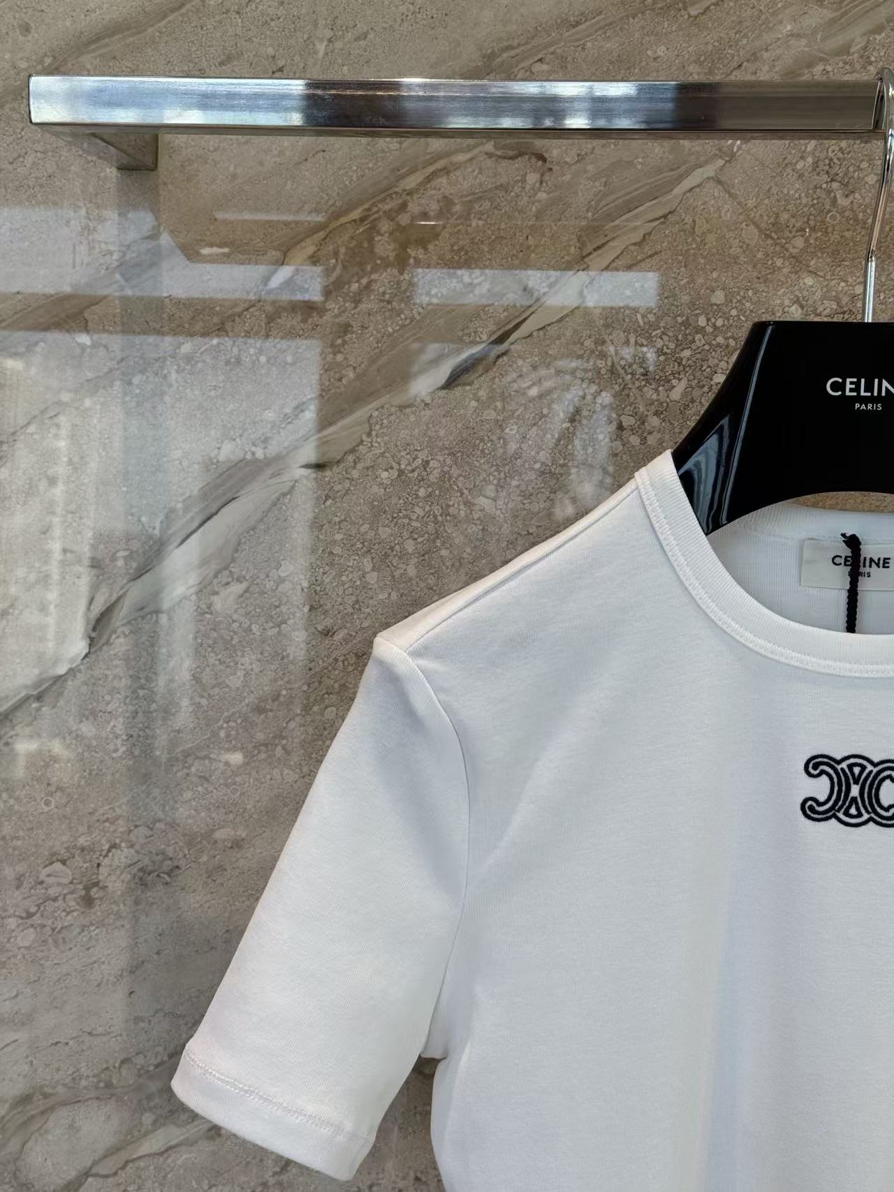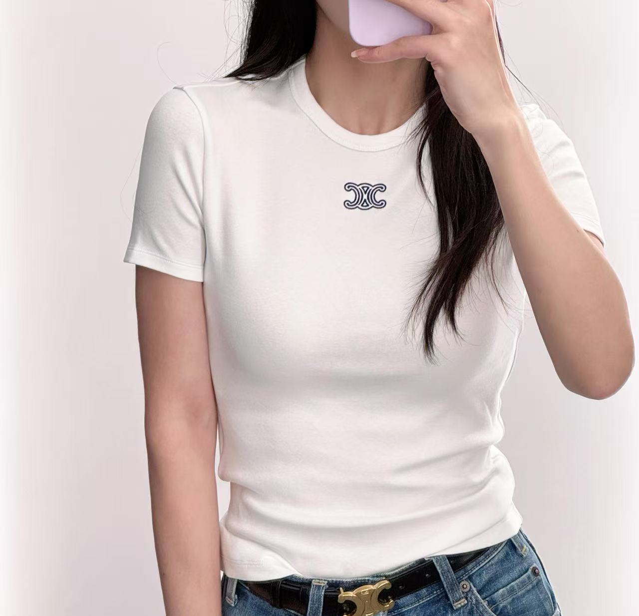 設計核心聚焦於胸前那枚精緻的凱旋門標誌刺繡,不同於大面積的印花,立體針法呈現出的高級辨識度,讓極簡的短 T 瞬間擁有不凡的精品底蘊。