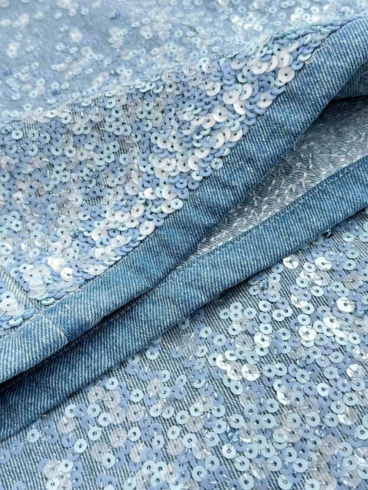 亮片刺繡:每條褲子使用約 240 顆手工縫製珠片,總針數近 98,000 針,採用層疊設計,每顆亮片由 5~6片組成,打造立體漸變光澤。