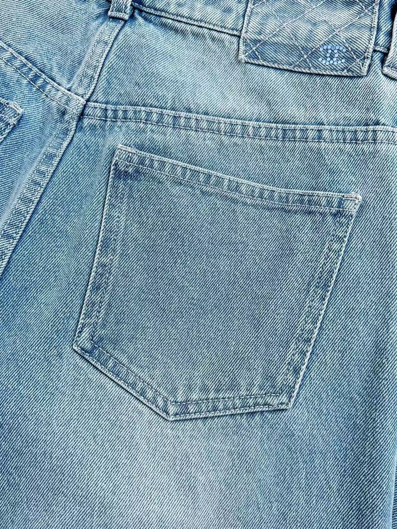 褲腳工藝:洗水前使用網紗保護褲腳,呈現自然褪色與深淺漸變感,洗水後再進行後續刺繡與腰頭加工。