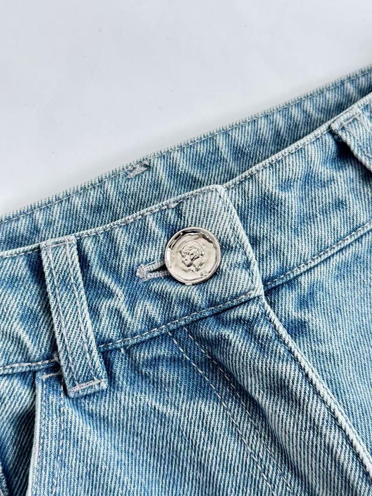 布料:丹寧牛仔布,經特殊做舊藍染處理,打造復古水洗質感。