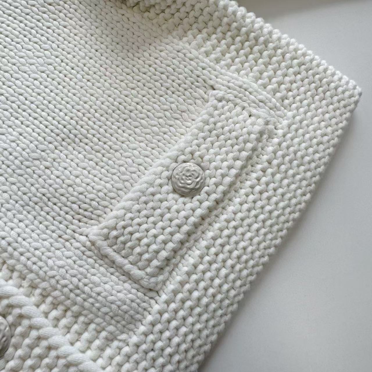 選用全棉紗線編織,觸感柔軟親膚,厚實有份量但不悶熱,粗針鉤織呈現出立體紋理感,讓整體版型更加挺括有型。
