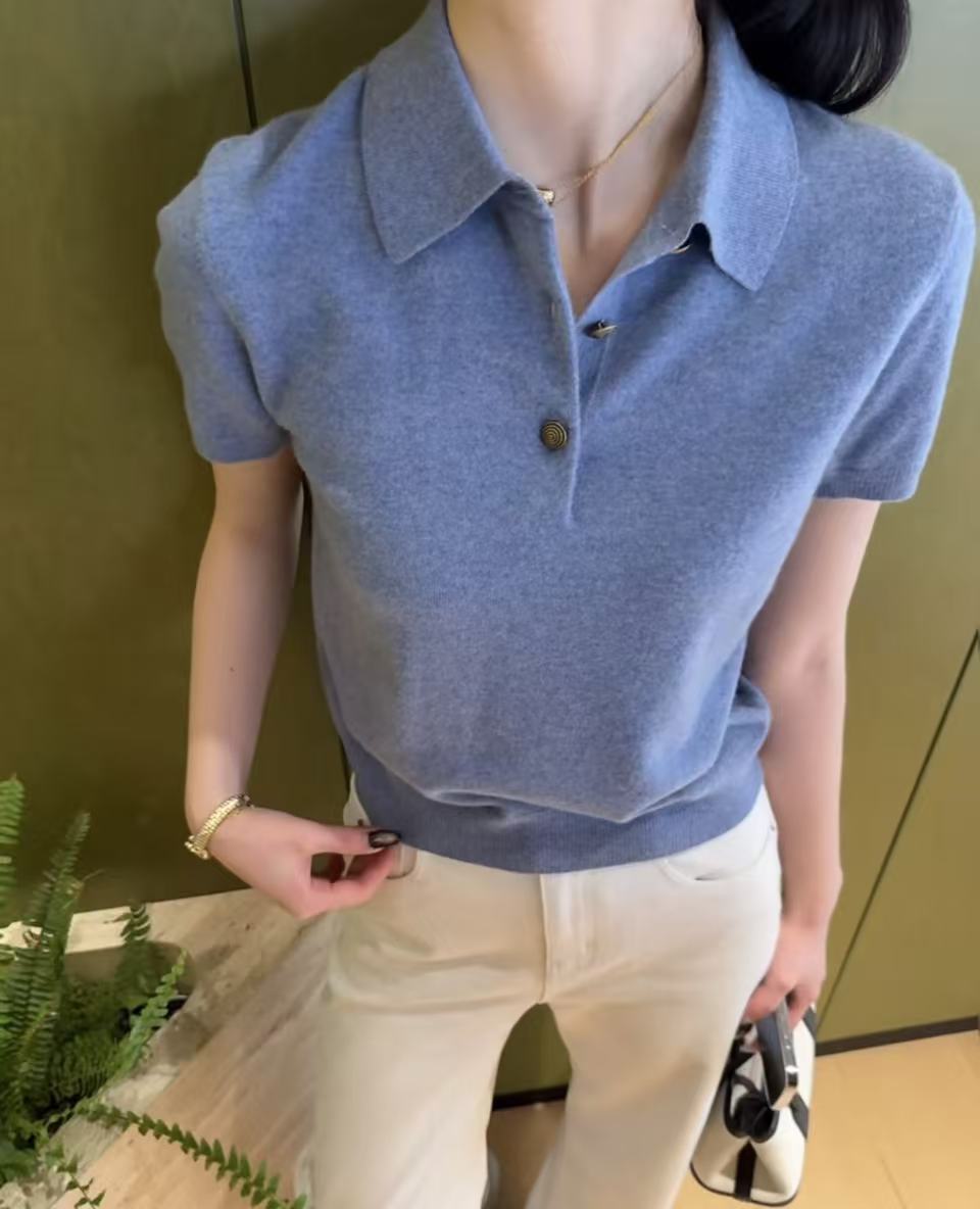 微寬鬆的 Polo 剪裁結合金屬鈕扣細節,展現出一種內斂且極致高級的時髦感