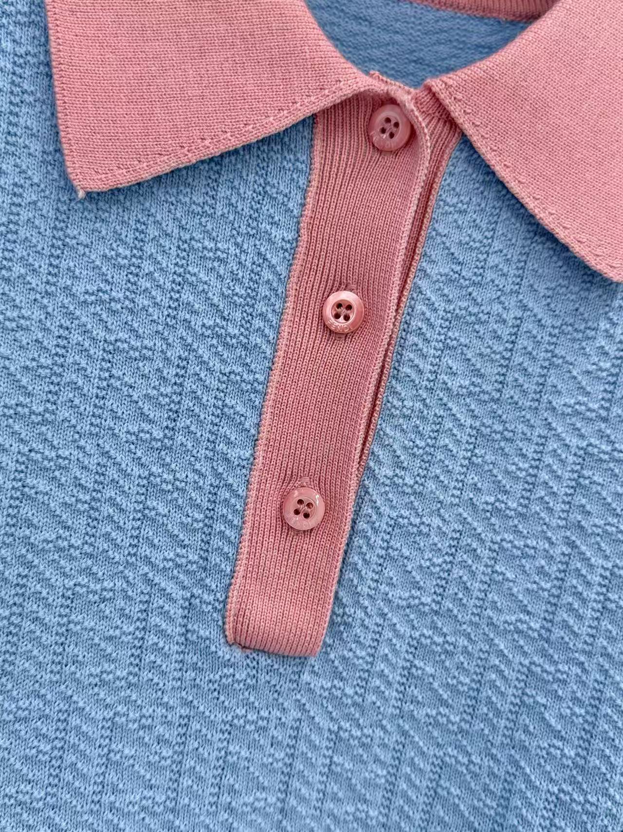 極致美學的撞色包邊處理: 領口的櫻花粉與袖口、下擺的亮黃色均採用了高密度定染羅紋,色牢度極高。
