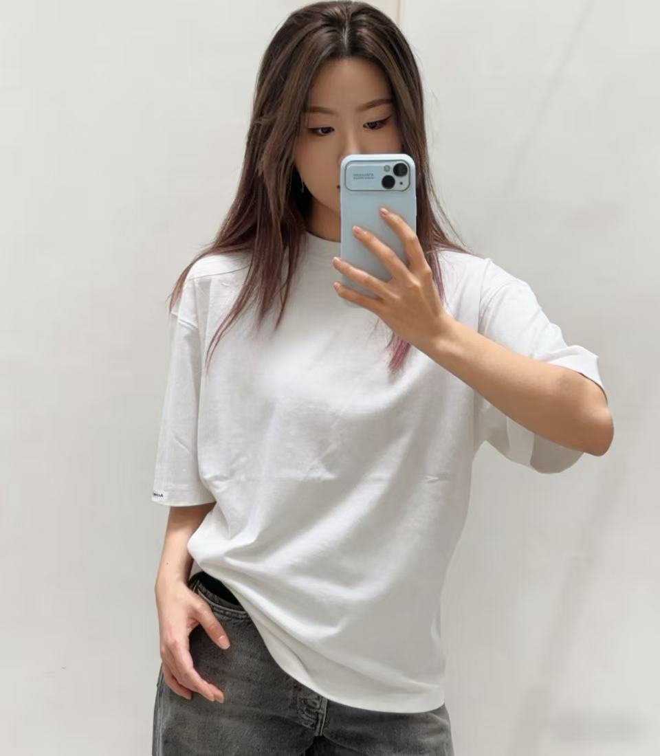 經典落肩半袖設計: 透過加寬的肩線與適中的袖長,完美修飾肩頸線條,打造極具空氣感的寬鬆廓形。