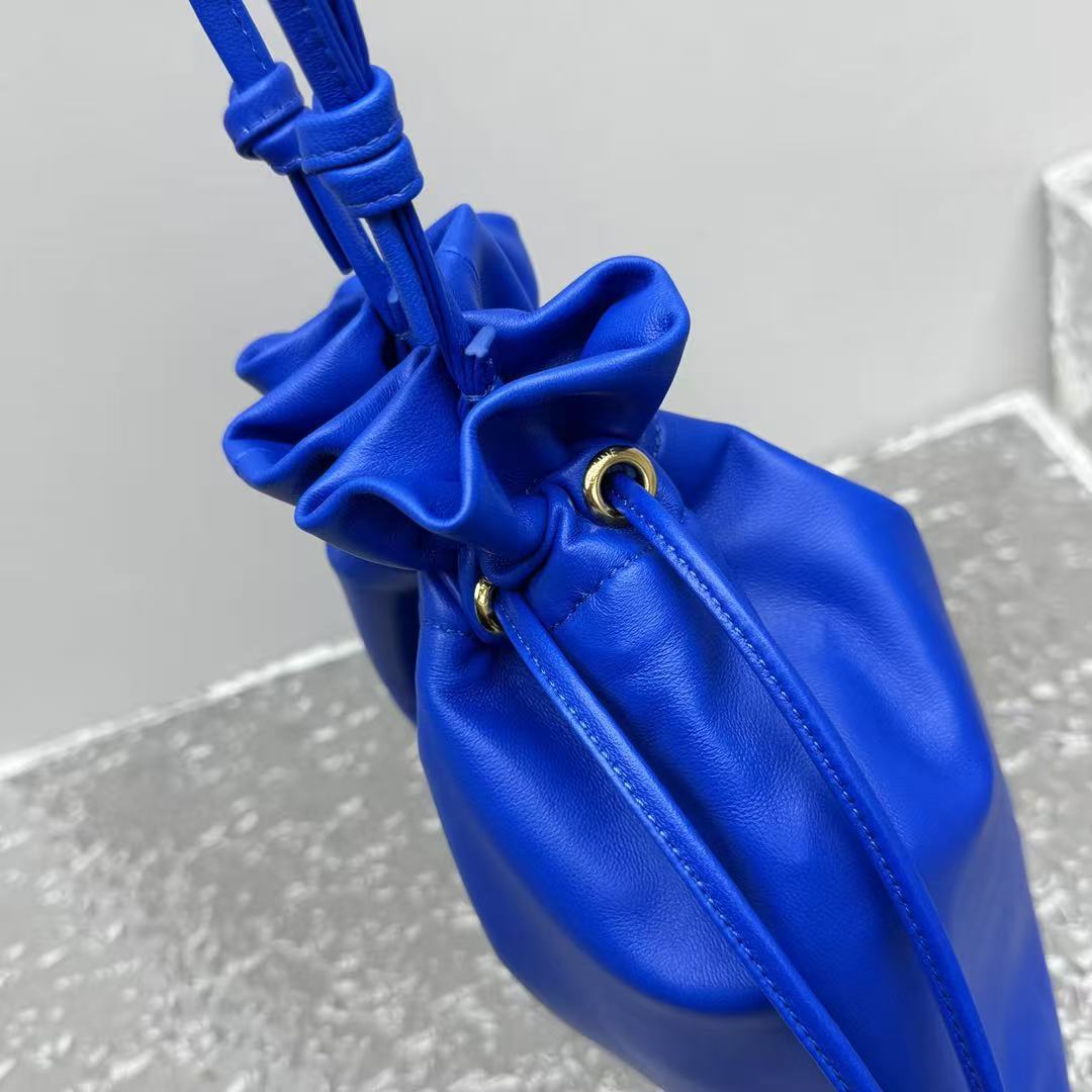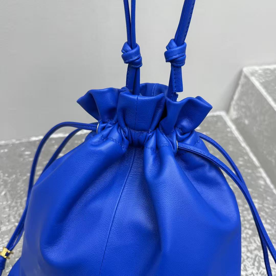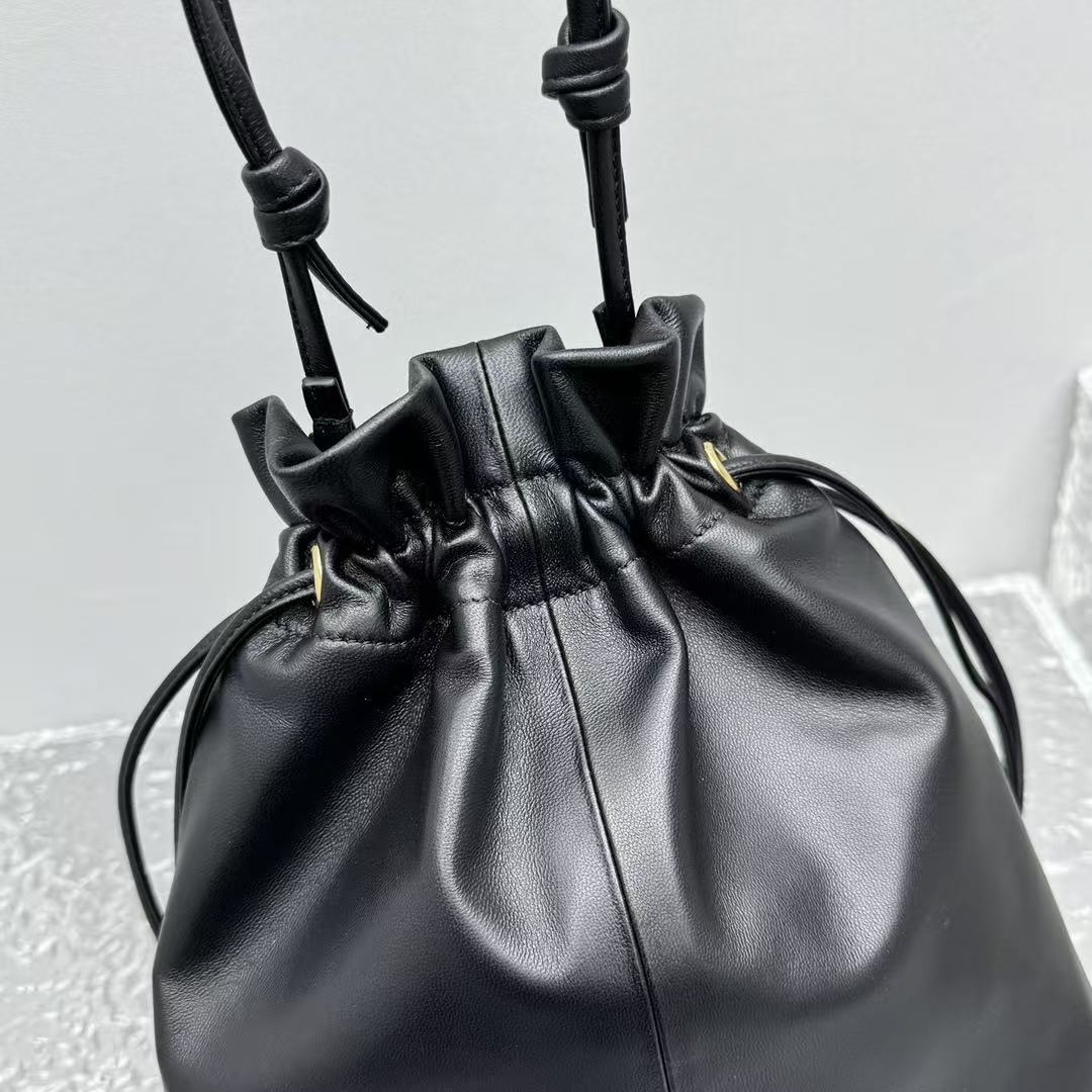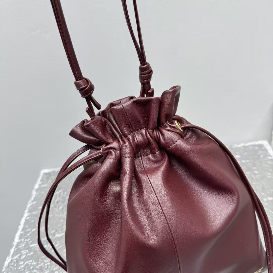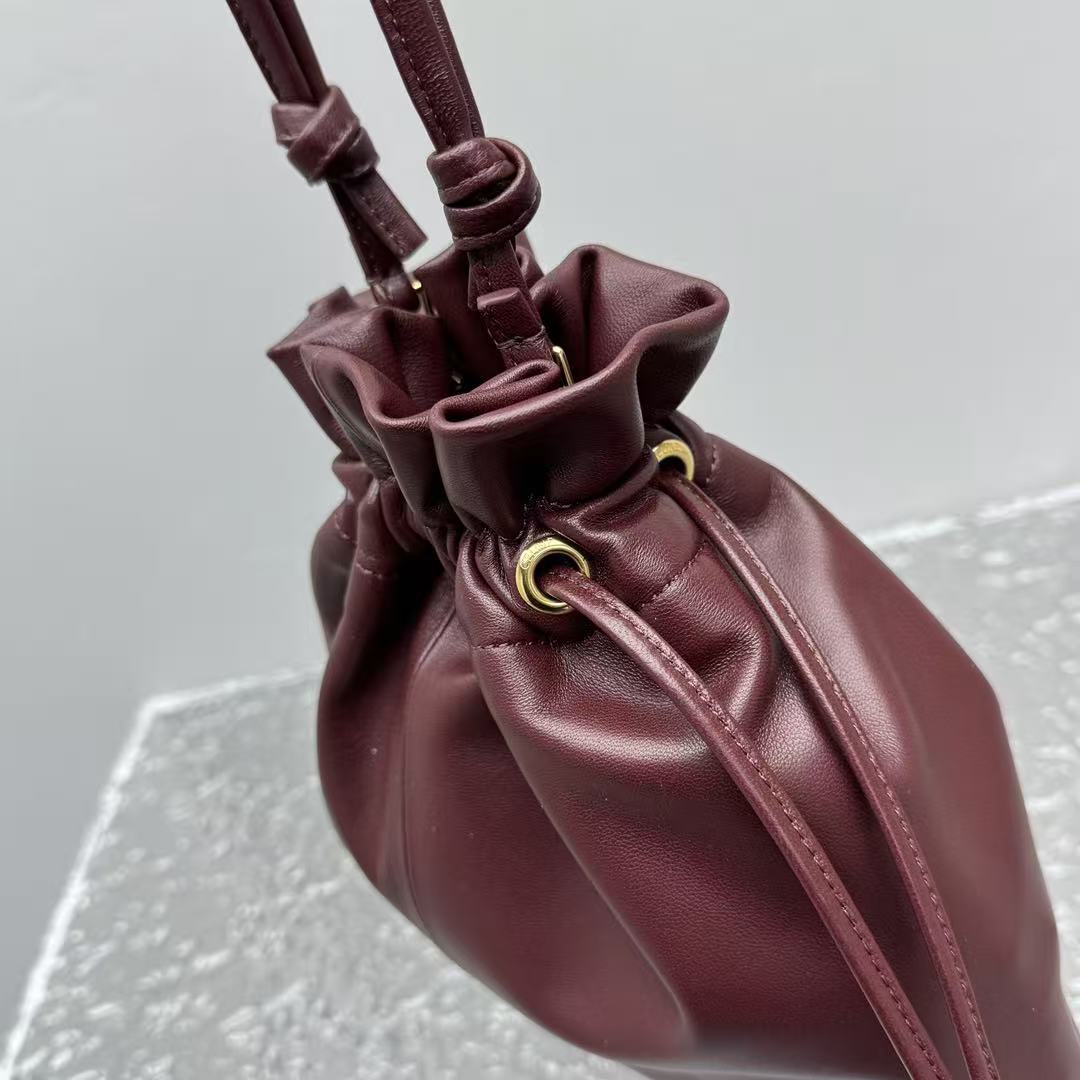 特性: 皮質細膩且觸感柔潤,自帶淡淡的高級光澤感。羊皮特有的柔軟度讓桶型包身能呈現出自然的垂墜褶皺,既輕盈又富有彈性。