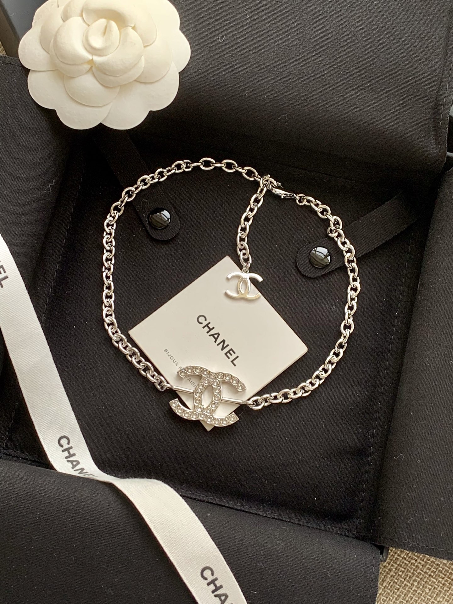 項鍊中央點綴標誌性的滿鑽雙C 標誌,採用密鑲工藝打造,閃耀度極高,無需過多裝飾就能立刻成為穿搭焦點。