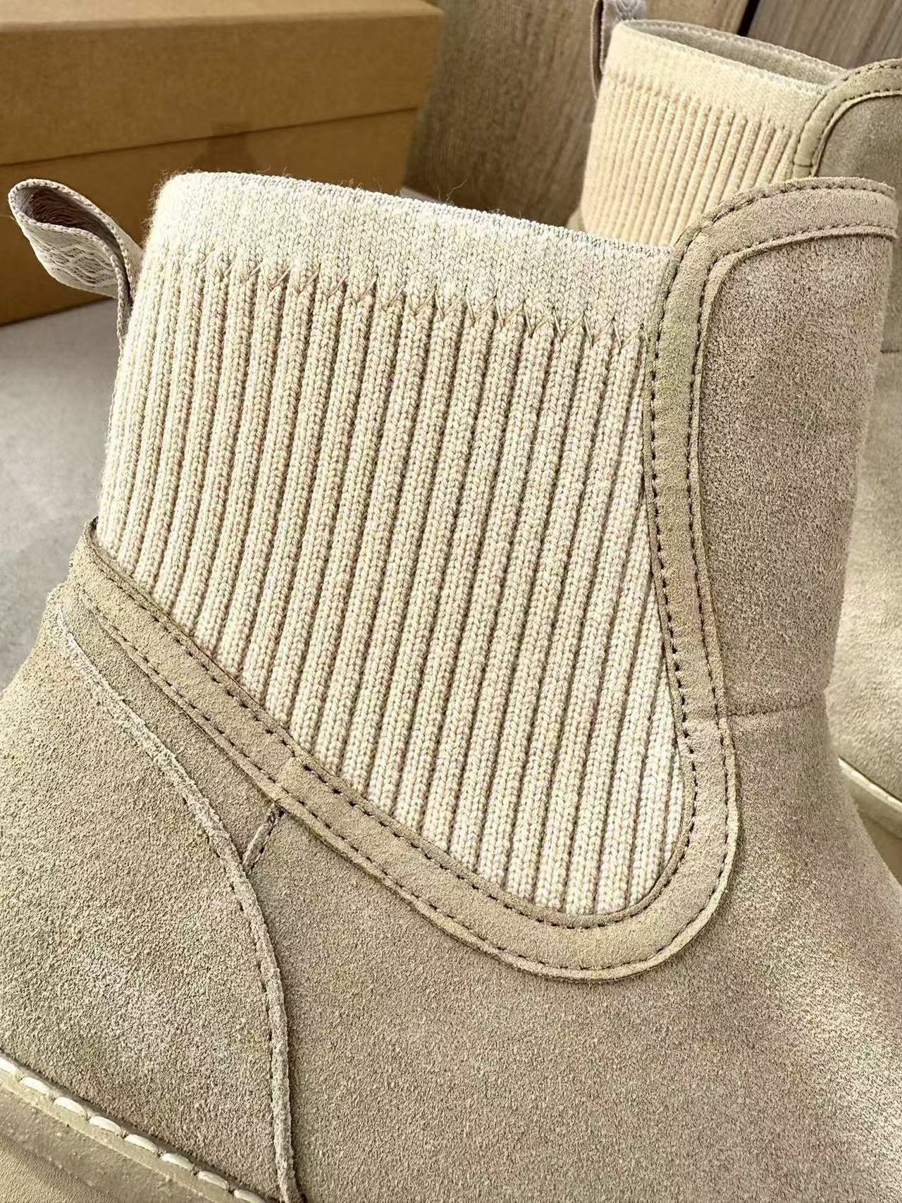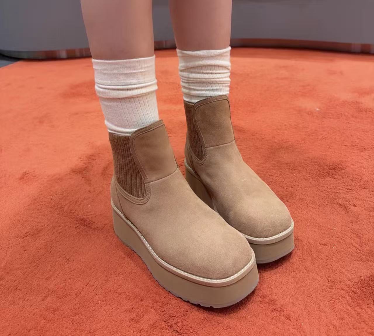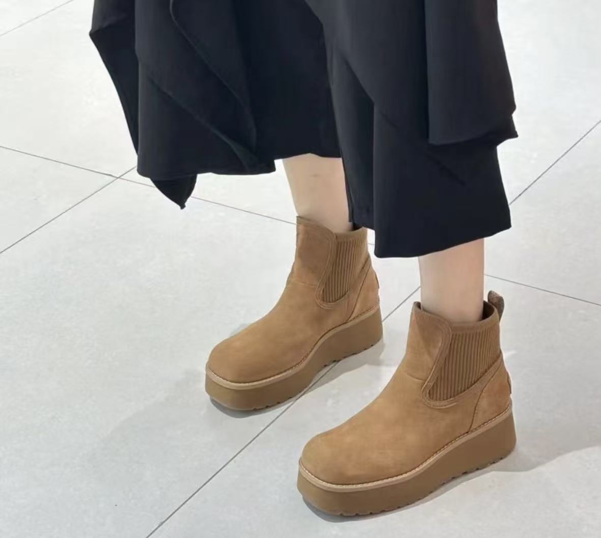 翻毛皮與針織拼接: 鞋身採用防潑水翻毛皮拼接彈力螺紋針織面料。這種材質碰撞既保留了翻毛皮的復古質感與防潑水性,又利用針織彈力解決了穿脫緊勒問題,輕鬆貼合不同腳型。