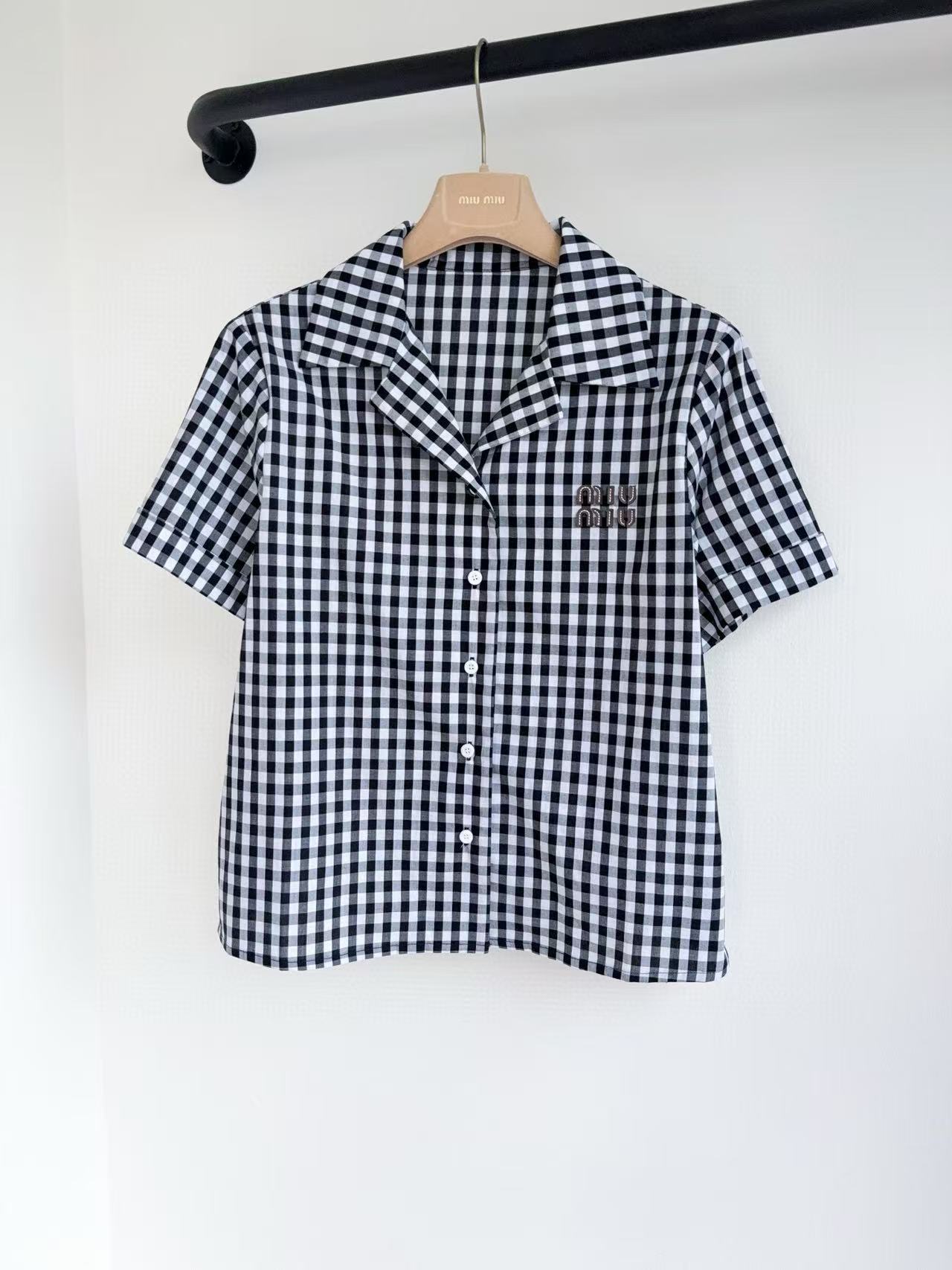 以黑白撞色細格紋為主調,短袖翻領襯衫,微寬鬆版型顯瘦又時髦。