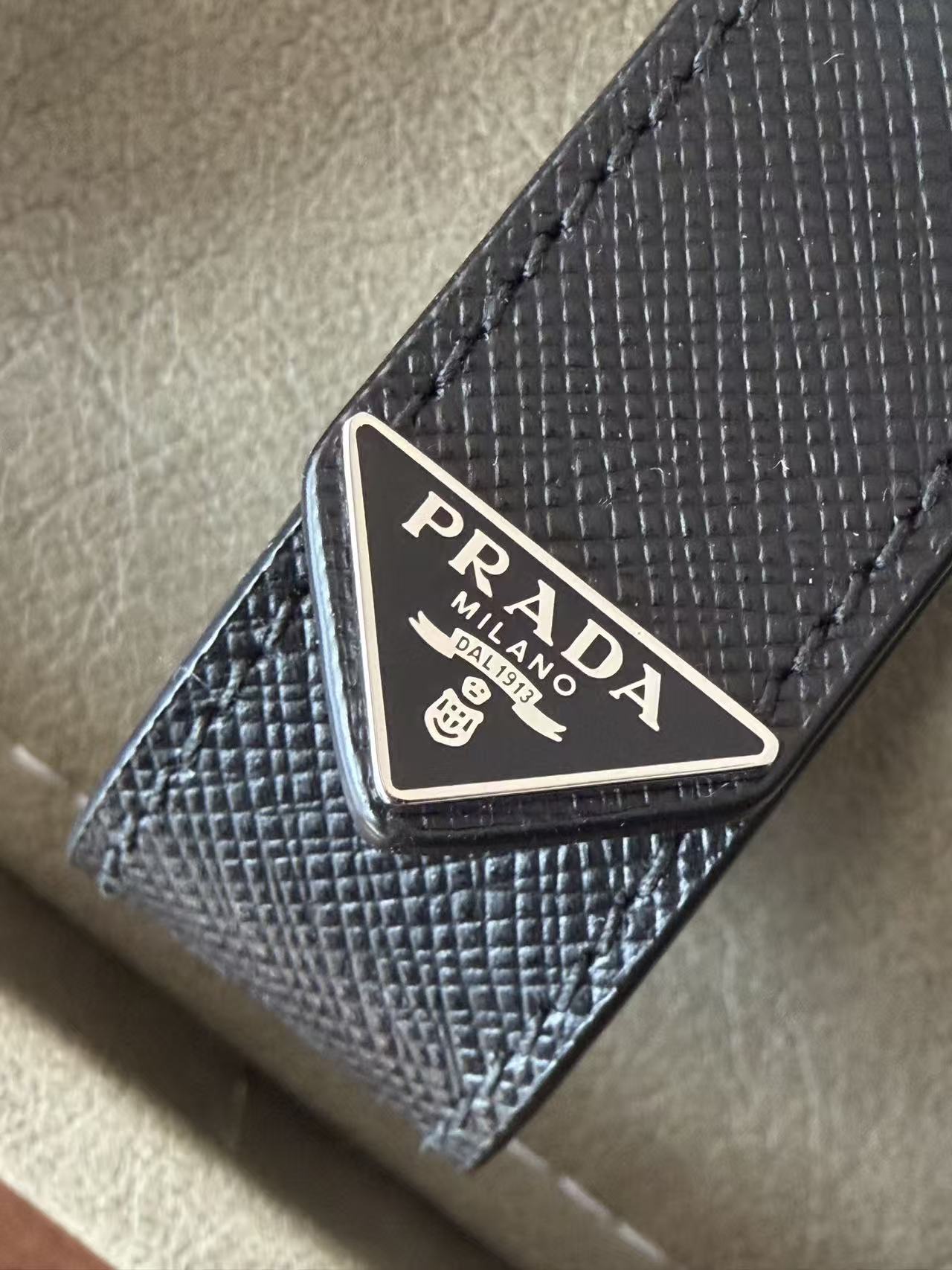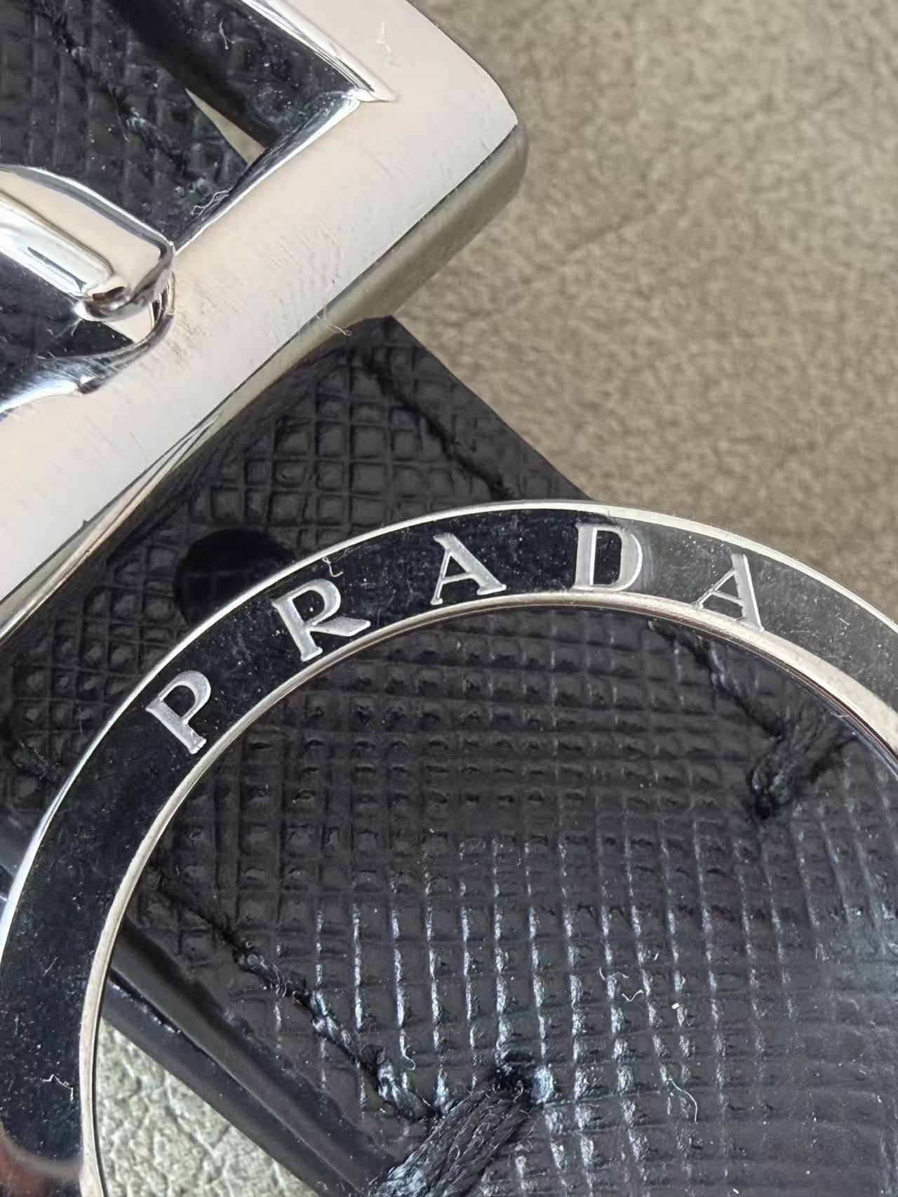 建築感冷冽五金配件: 選用高純度金屬打造環扣,色澤飽和且線條俐落,展現 Prada 一貫的現代都會美學。